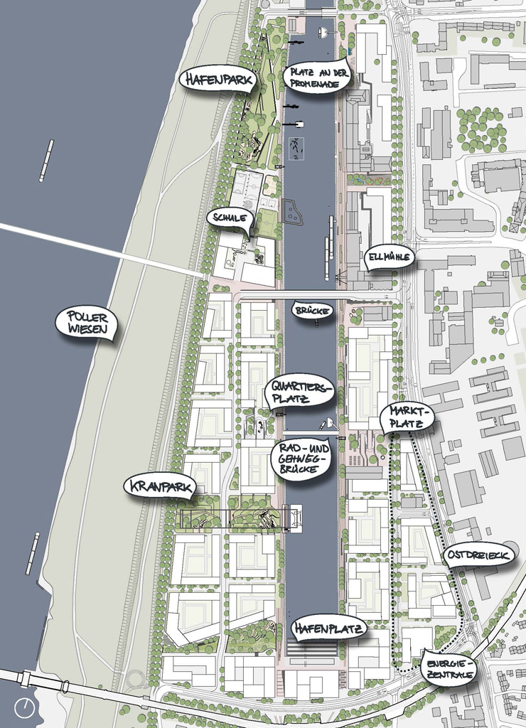 moderne stadt, die zusammen mit uns das Gelände entwickelt, sieht hier eine lebendige und breit angelegte Nutzungsmischung mit vielfältigen Wohnformen, einem 30-prozentigen Anteil geförderten Wohnungsbaus, Büros, Kindertagesstätten, Kreativ- und Dienstleistungsgewerbe, kulturellen Einrichtungen sowie öffentliche Freiflächen vor. Eine Voraussetzung für die zukünftige Nutzung des Hafenareals in Deutz ist neben dem Lärmschutz der Hochwasserschutz.