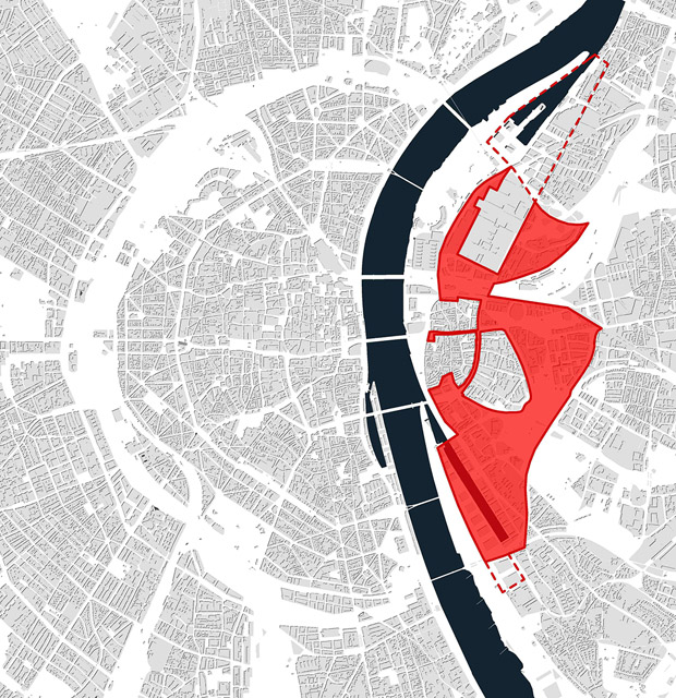 Die rechtsrheinische Innenstadt ist ein in weiten Teilen heterogenes Gefüge baulicher Strukturen mit unterschiedlicher Bausubstanz, Größe und Nutzung. Über die Jahrzehnte haben sich hier viele Funktionen angesiedelt, die aufgrund der linksrheinisch erhaltenen oder rekonstruierten historischen Strukturen keinen Platz finden konnten. Ein Ziel für diesen Interventionsraum ist die einheitliche Anordnung der einzelnen Quartiere. Außerdem sollen sie untereinander besser vernetzt und die dazwischen liegenden Grauzonen aufgelöst und nutzbar gemacht werden. Besonderes Augenmerk gilt der Ausbildung einer klaren Stadtkante entlang des grünen Ufers im Bereich des Rheinparks. Mit der Umnutzung der Hafenareale Deutz und Mülheim bekommt die rechte Rheinseite darüber hinaus eine städtebauliche Aufwertung und deutliche Erweiterung.