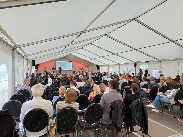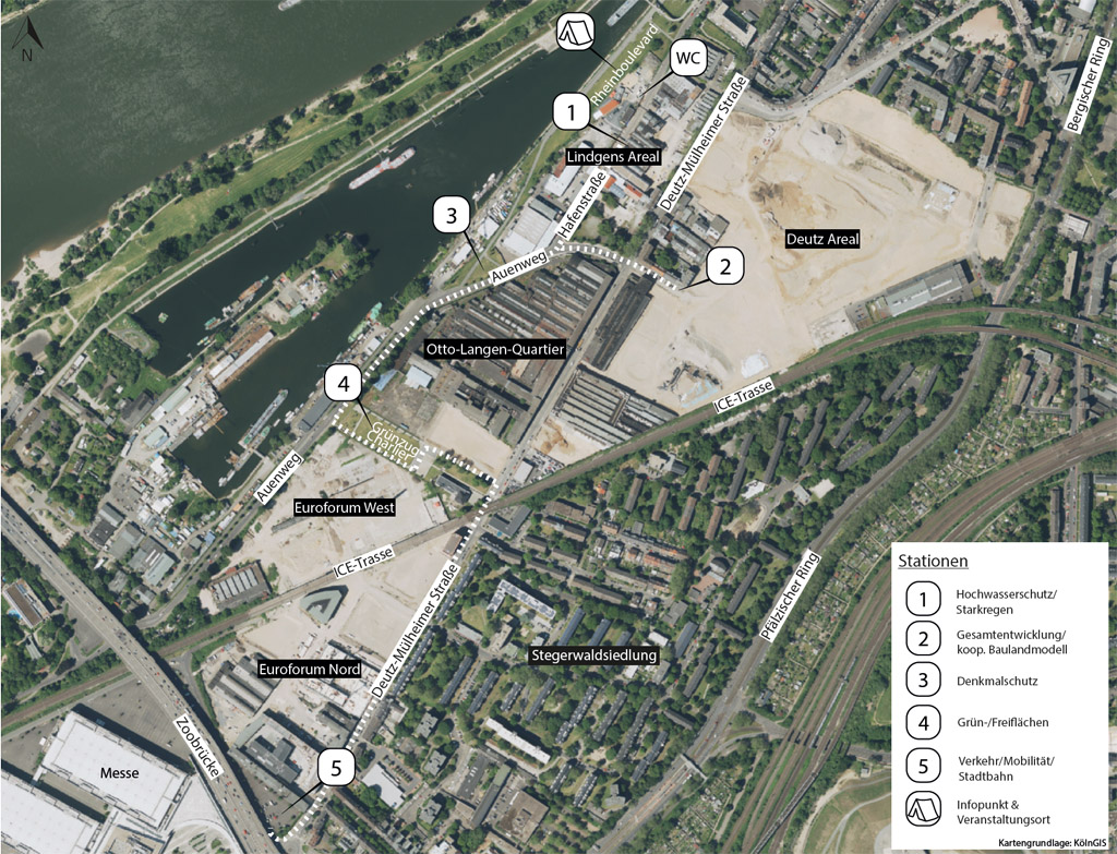 Der zweite Teil der Veranstaltung fand im Veranstaltungszelt im Rheinboulevard am Mülheimer Hafen fand. Zu Beginn begrüßte Oberbürgermeisterin Henriette Reker in einer Videobotschaft die Teilnehmenden. Danach informierten wir über den aktuellen Planungsstand, die städtischen Ziele und die Themen, die zur langwierigen Projektentwicklung führen. Die Bedeutung der Ergebnisse aus dem Werkstattverfahren 2013/2014 und der Industriegeschichte für die weitere Entwicklung wurden hierbei verdeutlicht. Anschließend berichteten die verschiedenen Fachämter über die einzelnen Planungsthemen. Besonderes Augenmerk galt hierbei dem Mobilitätskonzept mit Schwerpunkt auf die neue Stadtbahnanbindung, dem öffentlich geförderten Wohnungsbau sowie gemeinwohlorientierten Nutzungen.