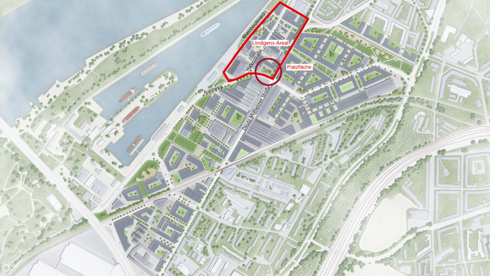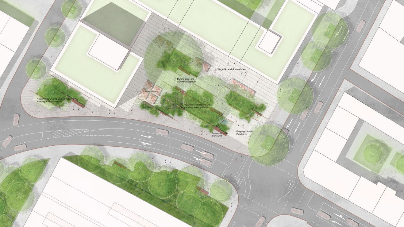 Mit dem Wettbewerbsverfahren wurde für die zukünftig öffentliche Platzfläche eine gestalterische und diesem Ort angemessene qualitätsvolle Gestaltung als Entrée in das neue Quartier gefunden. Der Platz ist dem Hochhaus und seiner angrenzenden Bebauung vorgelagert. Der vorhandene Baumbestand auf der Platzfläche wird erhalten und um zwei Bäume ergänzt. Er wird in zwei prägnante Pflanzinseln integriert, die in ihrer Ausgestaltung einer klimagerechten Platzgestaltung gerecht werden. Die Platzfläche übernimmt als neuer Quartiersplatz eine über das Lindgens-Areal hinausgehende übergeordnete vernetzende Funktion. Sie überzeugt mit einer hohen Nutzungsflexibilität und vielfältigen Aufenthaltsmöglichkeiten. Die Wettbewerbsbeiträge hatten wir vom 23. September bis 13. Oktober 2023 im Bezirksrathaus Mülheim öffentlich ausgestellt.