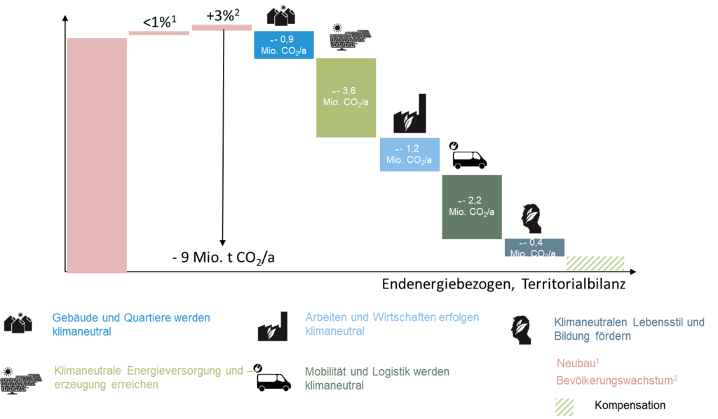 Ausgehend vom derzeitigen Emissionsniveau ist laut aktueller Berechnungen von einem weiteren Anstieg der Emissionen in Höhe von etwa 1 Prozent aufgrund von Neubautätigkeit sowie von rund 3 Prozent bedingt durch Bevölkerungswachstum zu rechnen. Dieser Anstieg ist in den Reduktionspfaden mit eingepreist.