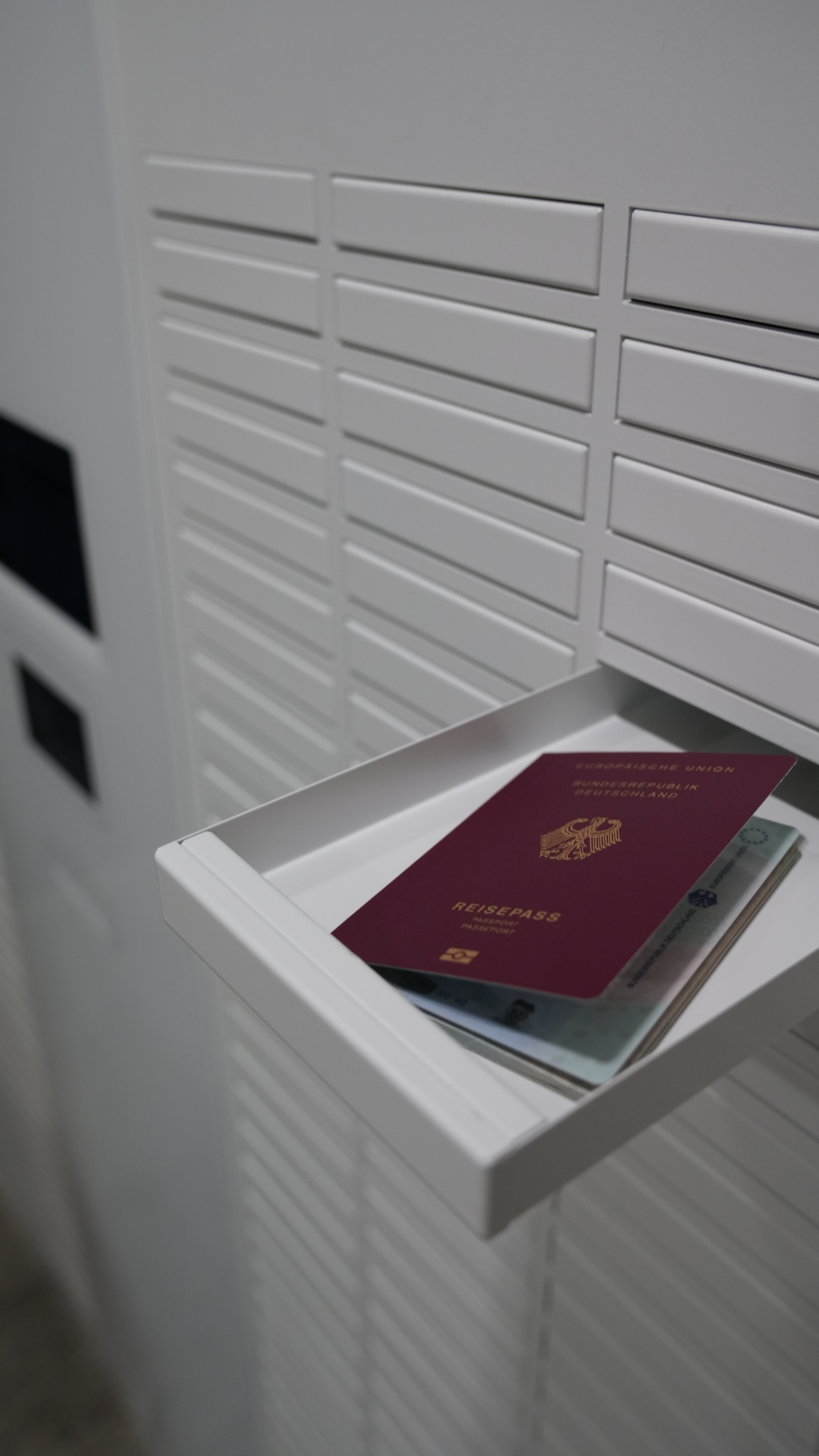 Sofern Sie einen gültigen Reisepass besitzen, müssen Sie diesen unbedingt zur Abholung am Dokumentenausgabeterminal mitbringen. Das Fach für den neuen Reisepass öffnet sich nur dann, wenn Ihr alter gültiger Reisepass am Dokumentenausgabeterminal entwertet wird.
