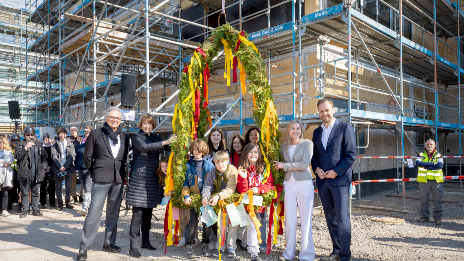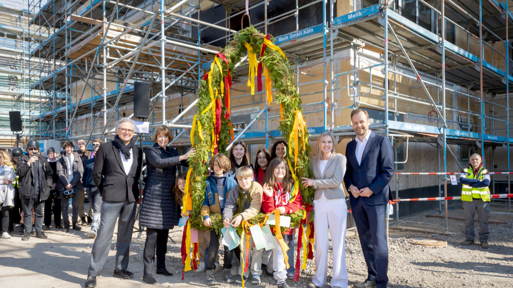 Schüler*innen haben das Richtfest für die neue Gesamtschule Ossendorf mitgestaltet. Sie formulierten ihre Wünsche, wie ein "Mädchenzimmer", "eine Bibliothek" oder "einen Fußballplatz mit zwei Toren" auf bunten Zetteln, die mit dem Richtkranz hoch an die Spitze der viergeschossigen Lernhäuser emporgezogen wurden. Dann wurde der Richtspruch gesprochen und ein symbolischer letzter Nagel in einem Dachbalken versenkt.