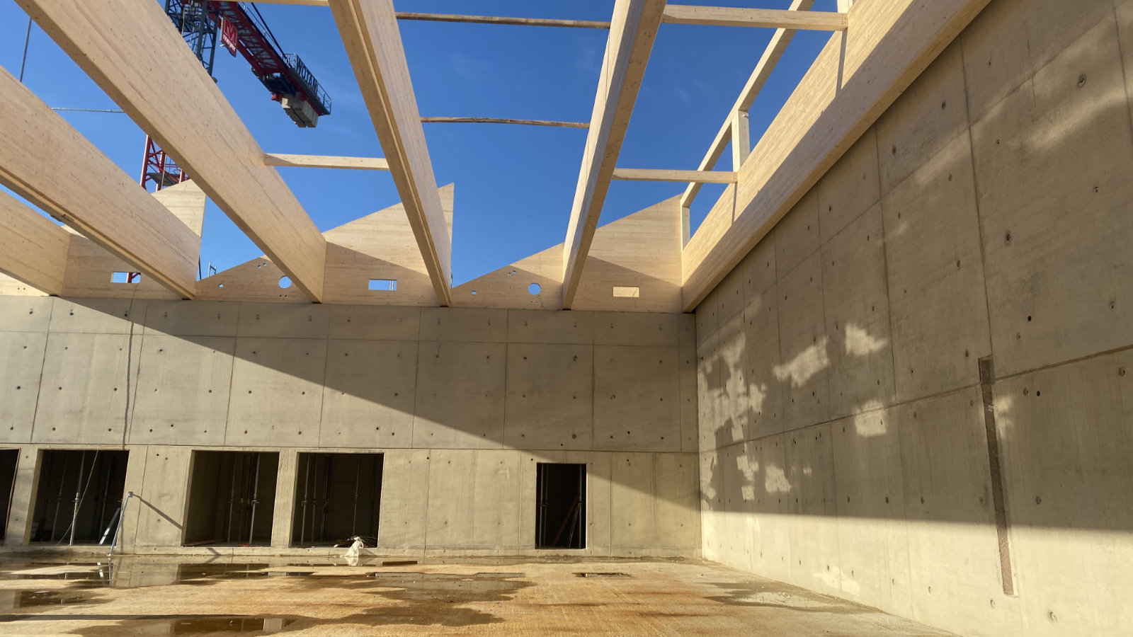 Die ersten Holzbauteile waren am 13. Mai 2024 angeliefert und montiert worden. Gründung, Treppenhauskerne und Brandwände sind komplett aus Stahlbeton. Die übrige Konstruktion vom Erdgeschoss bis zum dritten Obergeschoss besteht aus einer Holzhybrid-Konstruktion. Dabei besteht das vertikal tragende Bauwerk aus Holz und die Konstruktion der Geschossdecken aus Stahlbeton-Fertigteildecken, in Verbindung mit tragenden Holzbalkenquerschnitten. Holz- wie Stahlbetonelemente werden hauptsächlich als Fertigteile angeliefert. Durch den großen Vorfertigungsgrad im Holzbau ist ein zügiger Bauablauf möglich. Die Sporthalle errichten wir überwiegend mit einer Konstruktion aus Stahlbeton.