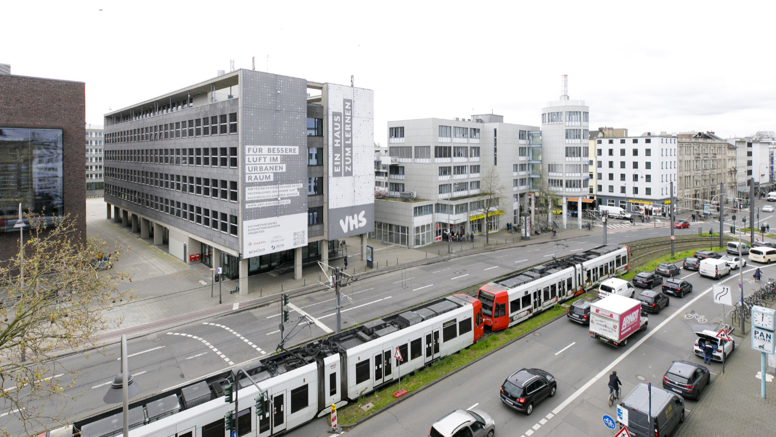 Zur Reinigung stickoxidbelasteter Luft in der Innenstadt realisieren wir gemeinsam mit der Stiftung "Lebendige Stadt" und dem Unternehmen Schüco ein Pilotprojekt. Dafür haben wir an der Volkshochschule nahe dem Neumarkt eine stickoxidbindende Textilfassade installiert, die die Luft an der stark befahrenen Cäcilienstraße filtert. Die Fassade besteht aus recycelten Materialien, darunter über 4.400 PET-Flaschen und Aluminium mit 76 Prozent Recyclinganteil. Der Luftfilter besteht aus zwei bedruckten Membranflächen in der Größe von jeweils 8 mal 20 Metern und ist mit einer Messtechnik ausgestattet. Durch die Messtechnik wird die Luftqualität vor und hinter der Membran gemessen, um die luftreinigende Filterleistung auszuwerten und zu dokumentieren. Schädliche Stickoxidbestandteile der Luft werden durch die katalytische Beschichtung der textilen Bespannung in unschädliche Verbindungen umgewandelt.