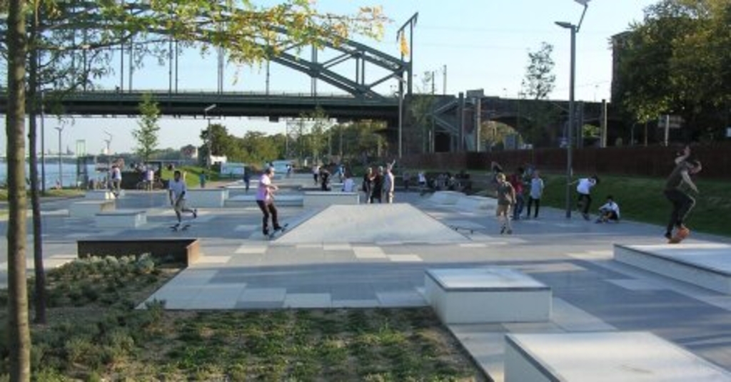 Die 2.000 Quadratmeter große, beleuchtete Skate Plaza im Rheinauhafen ist das ganze Jahr über ein beliebter Treffpunkt der Skaterszene.
