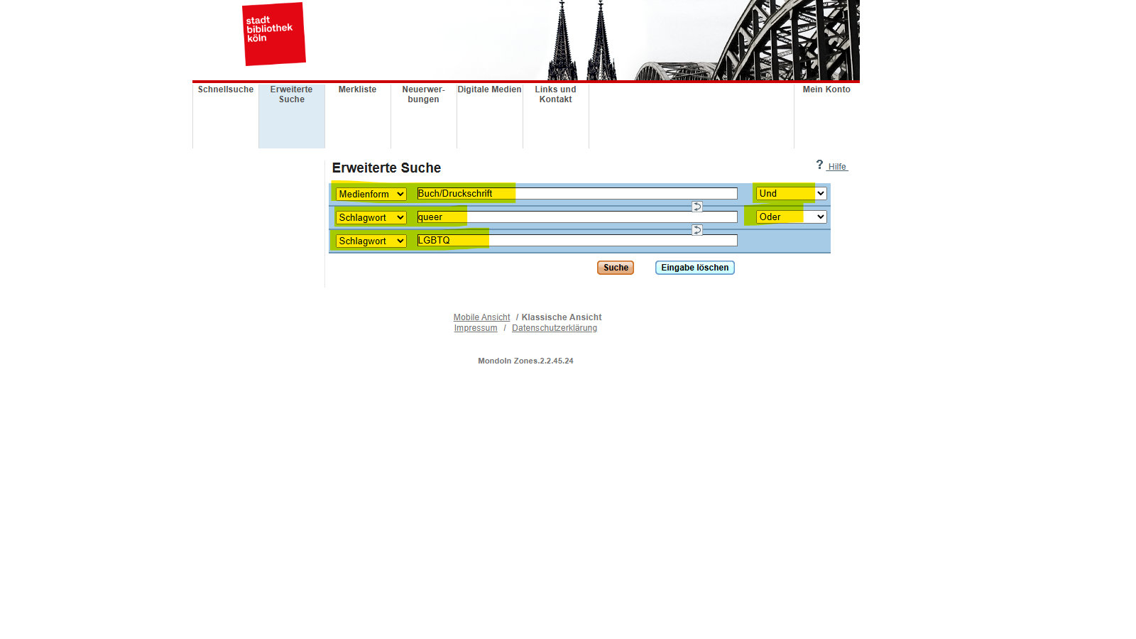 In der erweiterten Suche können Sie auf einfache Weise verschiedene Suchaspekte miteinander kombinieren. Sie finden sie in der oberen Navigationsleiste.