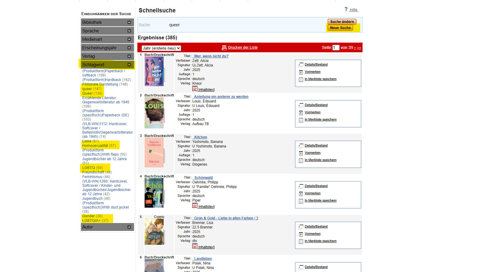 Interessant für Ihre Suche ist auch das Feld Schlagwort. Dort sehen Sie, unter welchen weiteren Schlagworten die gefundenen Medien aus der Ergebnisliste aufgeführt sind. Zum Beispiel Homosexualität, Gender, LGBTQ oder LGBTQIA+. Suchen Sie nach diesen Schlagwörtern, um weitere Titel zu finden. Ein Hinweis: nicht alle relevanten Titel sind über Schlagwörter auffindbar, daher empfiehlt sich auch immer die Suche über Stichwörter.