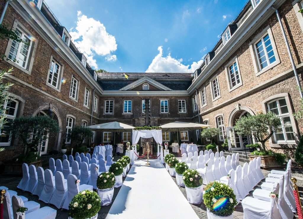 Verschiedene unterschiedlich große, repräsentative Räume stehen Ihnen für Ihre Trauung und Hochzeitsfeier zur Auswahl. Wenn das Wetter es zulässt, können Sie auch gerne im romantischen Innenhof vor einer Original-Stele des Kölner Doms heiraten.