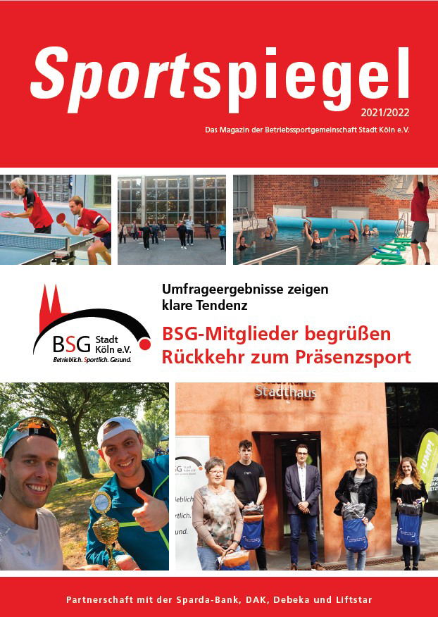 Wer einfach mal reinlesen oder sich über die Angebote der Betriebssportgemeinschaft Stadt Köln e. V. informieren möchte, kann den Sportspiegel bei der Geschäftsstelle anfordern.