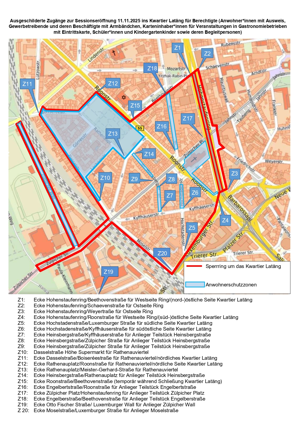 - Der Zugang ins Kwartier Latäng ist ausschließlich über die in der Karte eingezeichneten Zugänge möglich. Auf die Zülpicher Straße führen ausschließlich die Zugänge an der Uni-Mensa sowie auf der Roonstraße/Ecke Beethovenstraße. Die Heinsbergstraße zwischen Kyffhäuserstraße und Zülpicher Straße ist erneut passierbar.