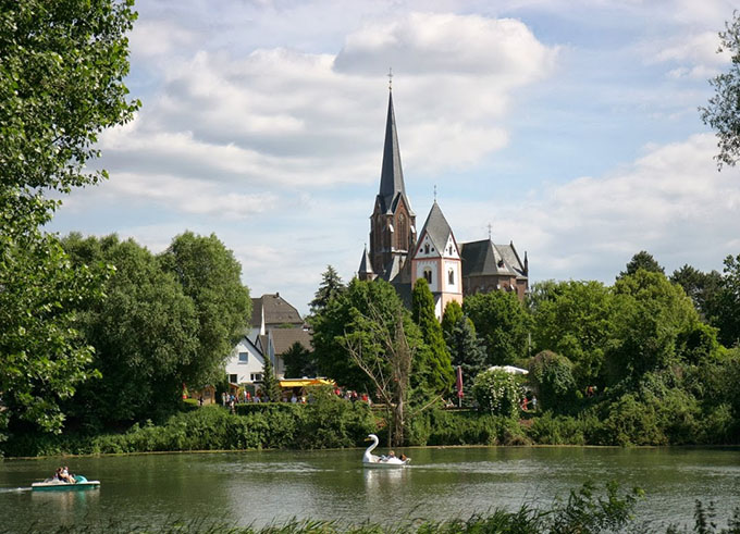Zwischen März und Oktober kann man mit einer kleinen Fähre rasch auf die linke Rheinseite zum gegenüberliegenden Stadtteil Weiß übersetzen.