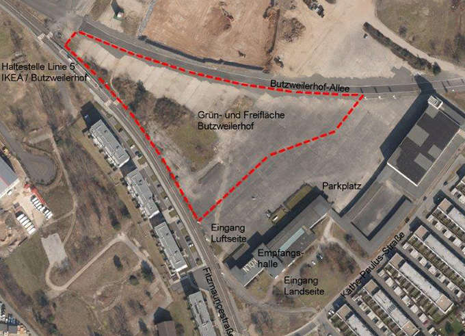Im Stadtteil Ossendorf ist eine etwa 17.000 Quadratmeter große öffentliche, quartiersbezogene Grün- und Freifläche mit integriertem Spielplatz (etwa 4.000 Quadratmeter) für Kinder und Jugendliche an der Fitzmauricestraße und der neu entstehenden Butzweilerhof-Allee entstanden. Den süd-östlichen Abschluss bildet das ehemalige Rollfeld mit der Empfangs- und Abfertigungshalle des ehemaligen Flughafens.