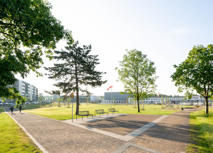 Ziel war die Schaffung eines grünen Mittelpunktes für das neue Wohn- und Arbeitsquartier, der sowohl Aufenthaltsqualitäten für die Bewohnerinnen und Bewohner sowie Beschäftigten des neuen Quartiers entfaltet als auch eine weitere Attraktivitätssteigerung in Bezug auf das Flughafenensemble.