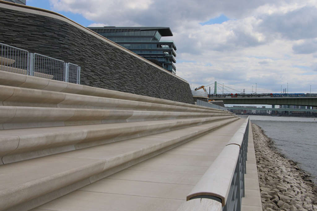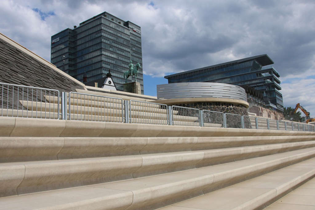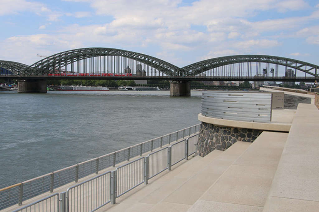 Mit der Freitreppe des Rheinboulevards haben Köln und seine Gäste einen Anziehungspunkt ersten Ranges. Von hier bietet sich ein unvergleichbarer Ausblick auf das berühmte Altstadtpanorama mit dem Dom. Die rund 500 Meter lange Freitreppe setzt diese Ansicht grandios in Szene. Aber auch der Anblick der Treppe steigert die Attraktivität der Kölner City. Er verleiht der rechten Rheinseite einen neuen, eigenen und starken Charakter. Für die Besucher*innen der Stadt, die sich entweder an einem der Ufer aufhalten oder mit der Bahn über die Hohenzollernbrücke in die Stadt kommen, rahmt der neue Zugang zum Wasser den Rhein in prägnanter und repräsentativer Weise ein.