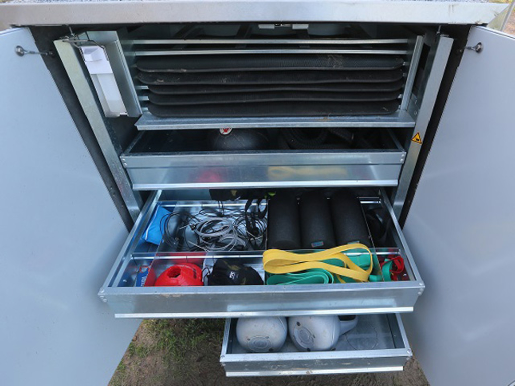 Folgende Sportgeräte stehen zur Verfügung: Fitness- und Yogamatten, Medizinbälle, Battleropes, Kettlebells, TRX Gurte und Schlingen, Springseile, Minibands, Superbands, Pylonen, Blackrolls und Trainingsleitern. Zudem bietet eine Technikschublade die Möglichkeiten, Musik über Bluetooth Musikbox abzuspielen. Ein Ersthilfe-Paket rundet die Ausstattung ab.
