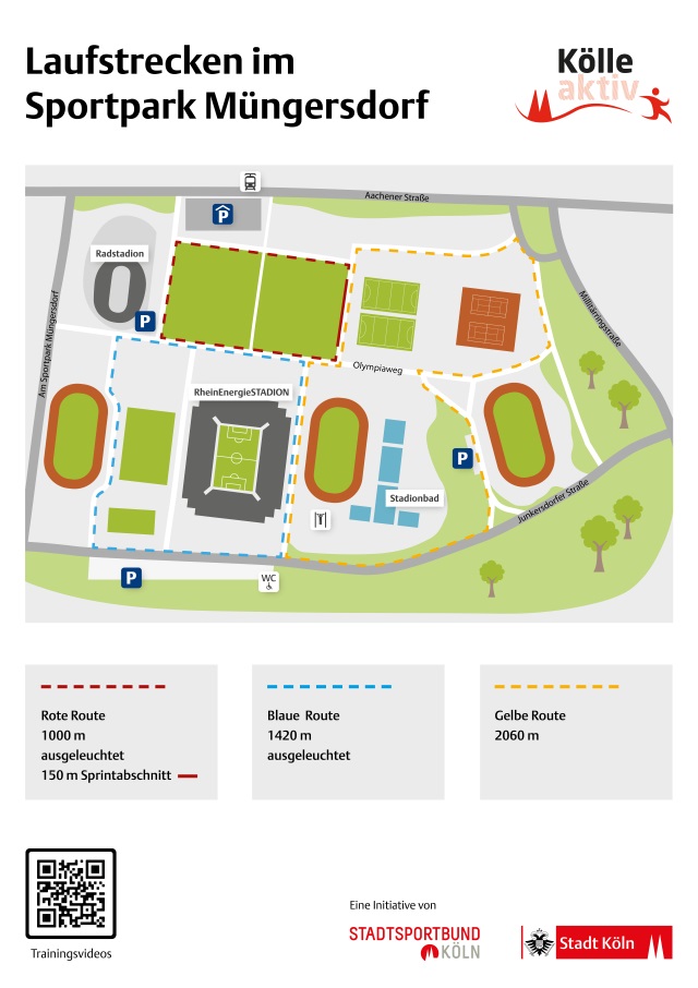 Eine 1.000 Meter-Distanz (rote Route) mit einem 150 Meter langen Sprintabschnitt verläuft rund um die Stadionvorwiesen. Die blaue Route über 1.420 Meter führt rund um das RheinEnergieSTADION und die Westkampfbahn. Beide Routen sind ausgeleuchtet. Der Startpunkt befindet sich am Peter-Günther-Weg (Parkplatz S1).