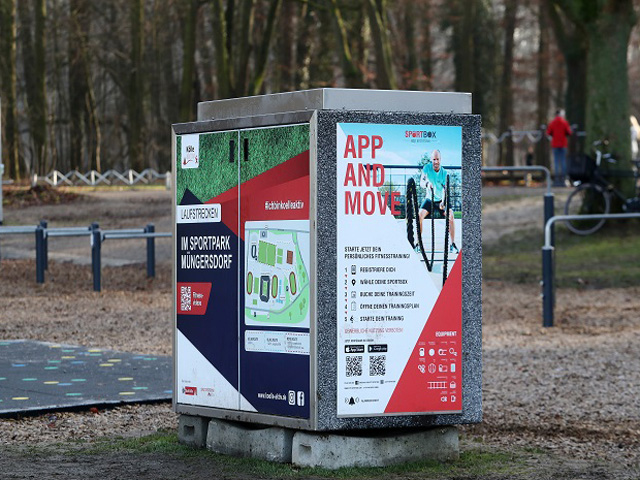 Im Rahmen der Bewegungsinitiative "Kölle aktiv" wurden im Stadtgebiet interaktive SportBoxen mit umfassendem Trainingsequipment aufgestellt. Über eine App wählen Interessierte ihre Trainingszeit aus, laden Freund*innen ein, finden Übungsanleitungen und übernehmen Trainingspläne.