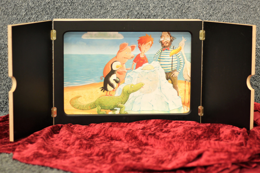 Warum ist das Kamishibai ein Erzähltheater? Weil es sich um eine kleine Erzählbühne handelt, die aus einem Holzkasten mit Flügeltüren, Vorhang und Bildkarten besteht.