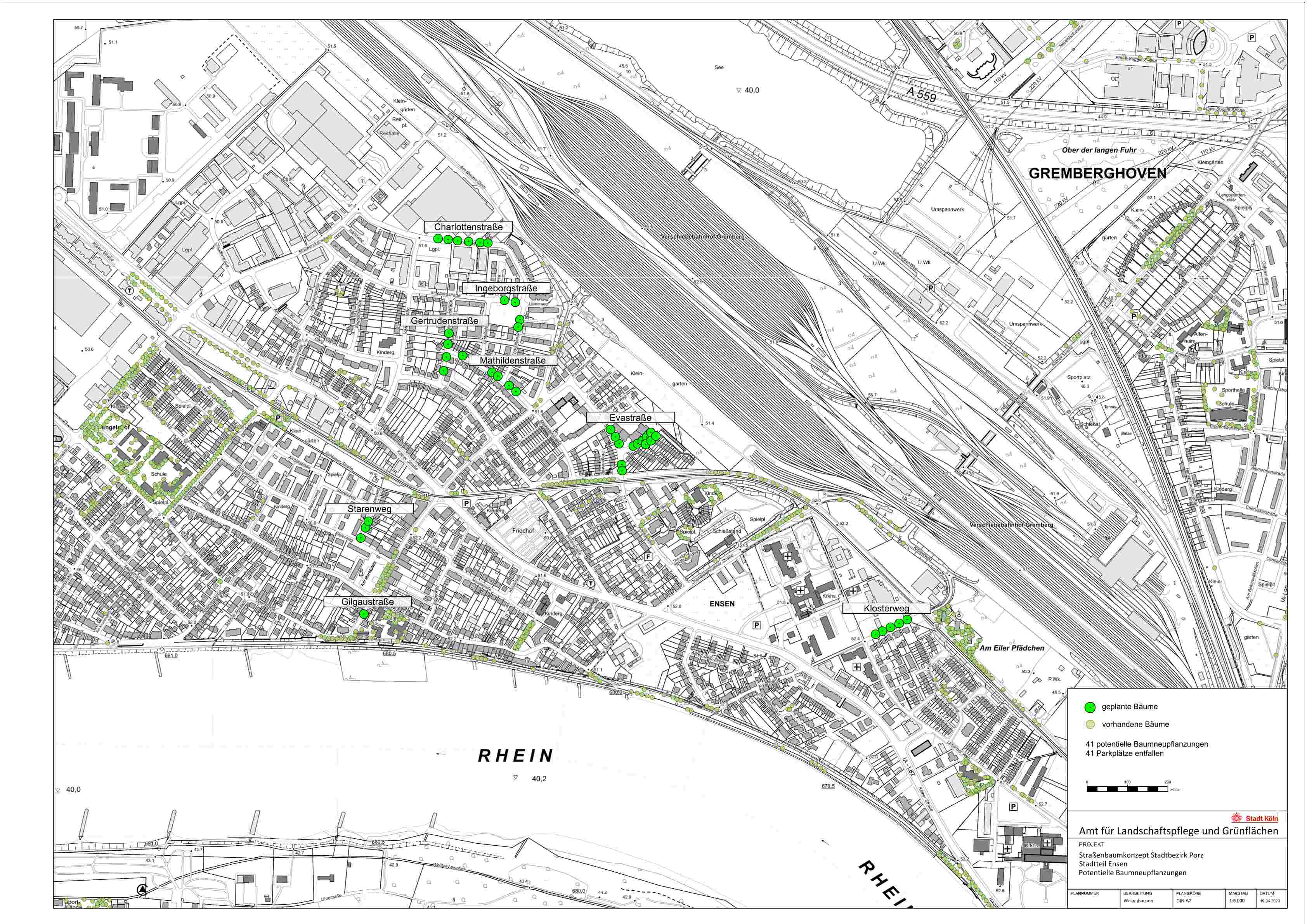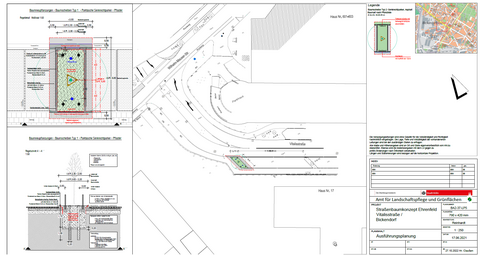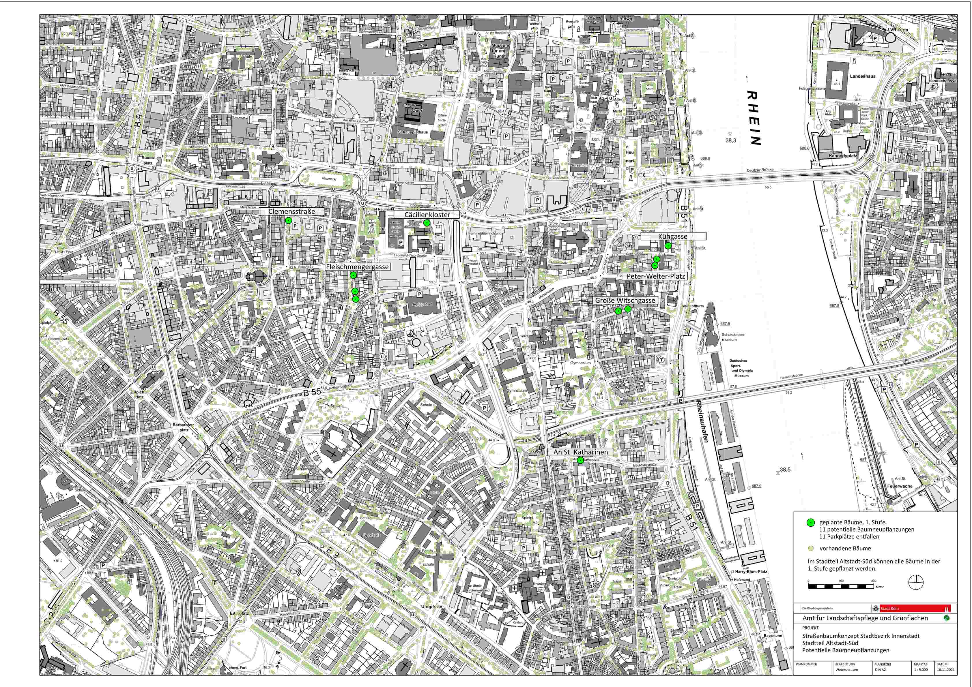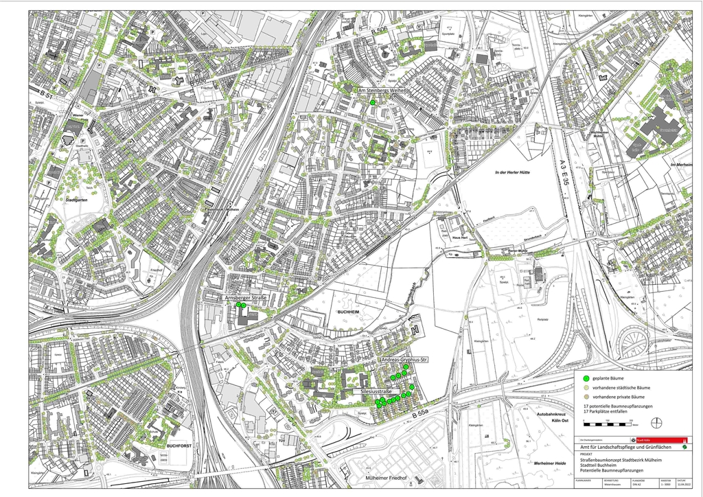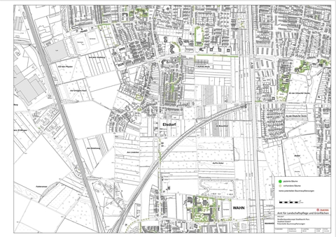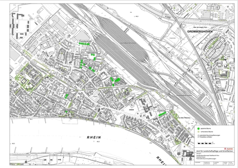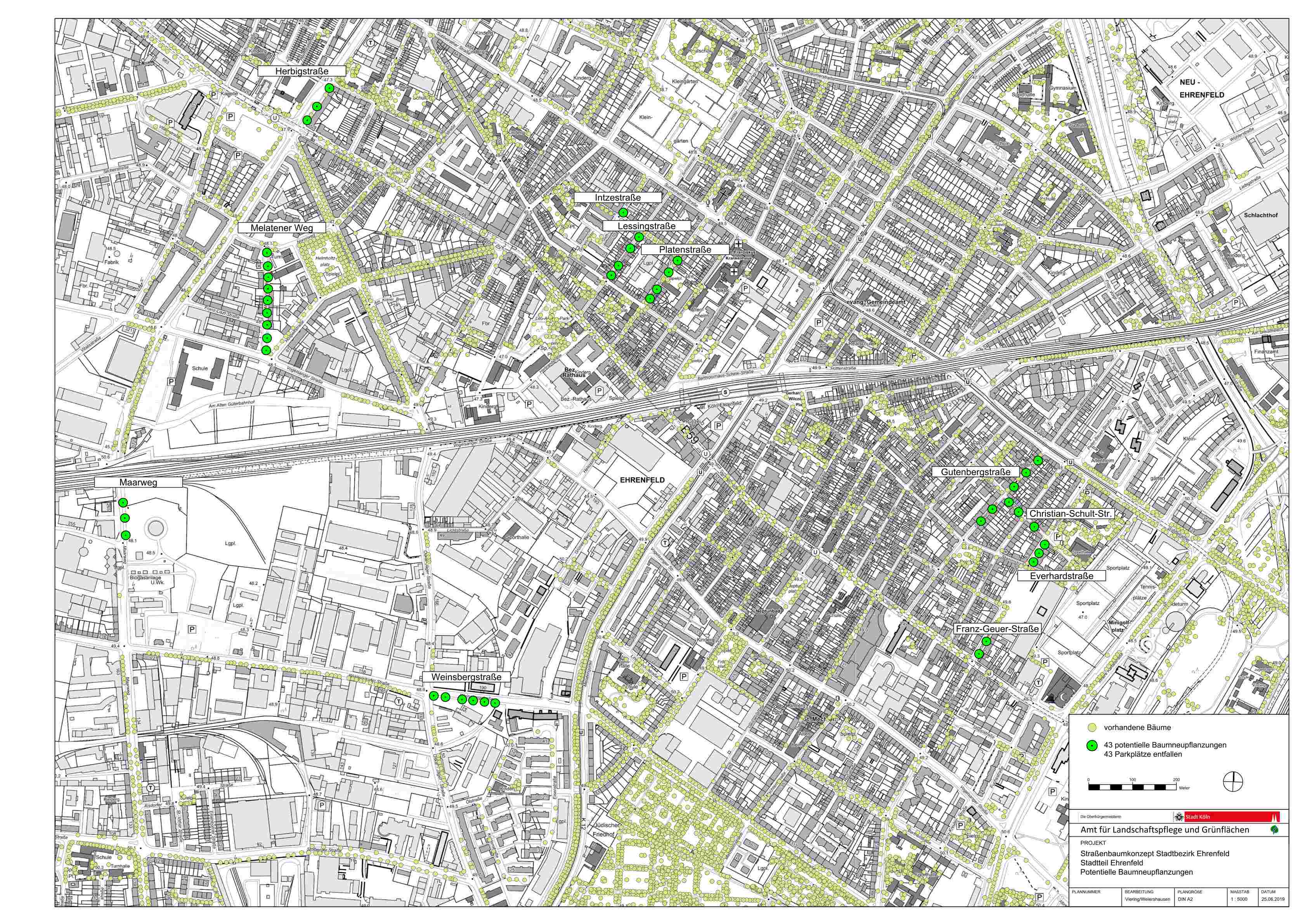 Nach dieser eingehenden Untersuchung wurde für jeden Stadtteil ein gesonderter Plan erarbeitet, in dem sowohl die vorhandenen, als auch die potentiell neu zu pflanzenden Straßenbäume eingetragen wurden.