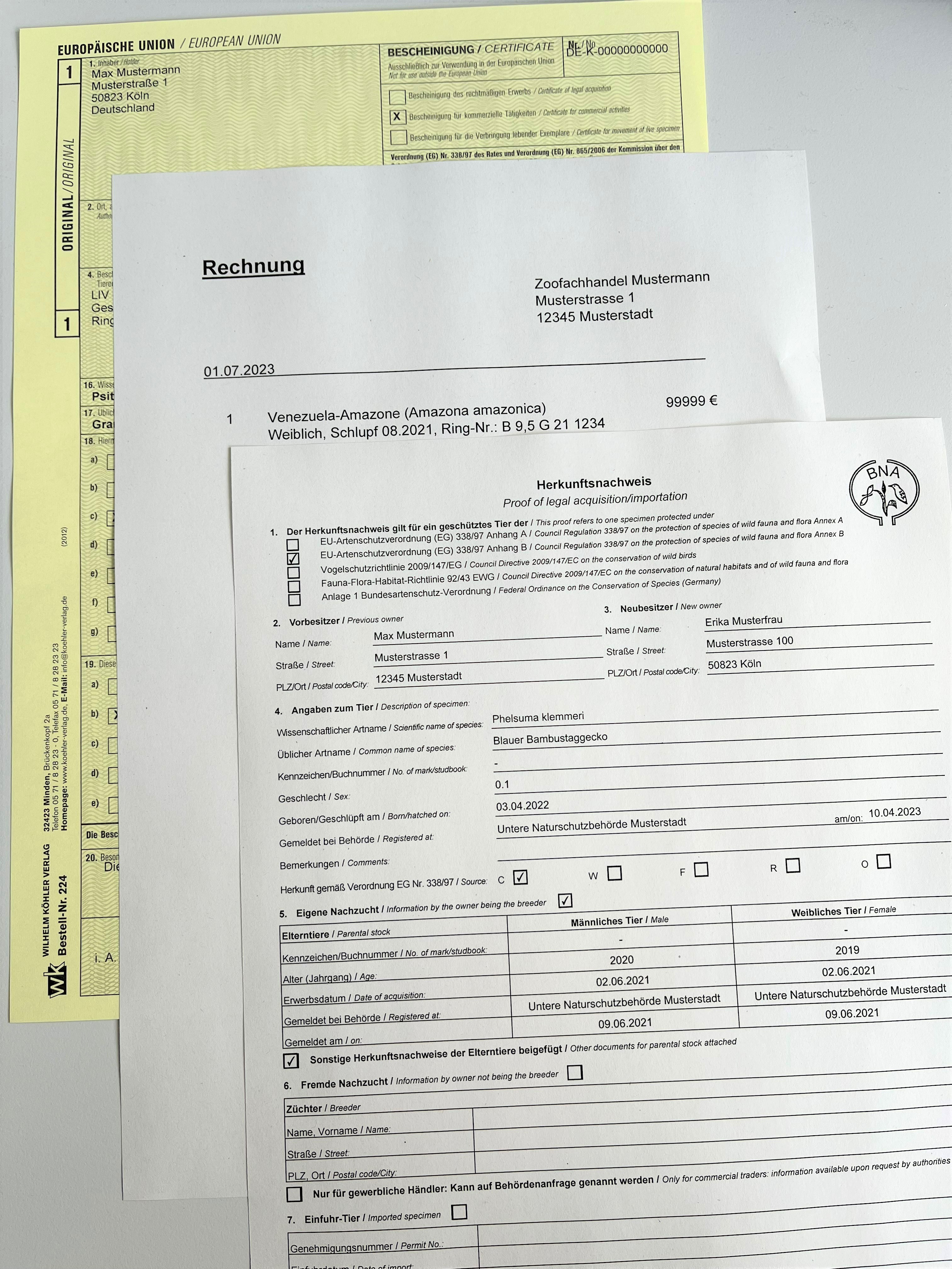 Beim Kauf von Tieren aus dem Zoohandel genügt eine Rechnung als Nachweis. Diese sollte möglichst viele Informationen (Alter, Geschlecht, Kennzeichnung) über das erworbene Tier enthalten.