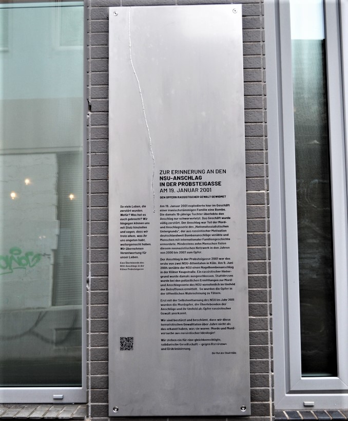 Den ersten Anschlag in Köln verübte der NSU am 19. Januar 2001 in dem Geschäft einer iranischstämmigen Familie in der Probsteigasse. Die damals 19-jährige Tochter erlitt dabei schwerste Verletzungen. Zu der Tat bekannte sich der NSU in seinem perfiden Bekenner-Video, das 2011 bei seiner Selbstenttarnung bekannt wurde. Daher ist im Zusammenhang mit den NSU-Anschlägen in Köln neben dem Bombenanschlag in der Keupstraße auch immer des Anschlags in der Probsteigasse zu gedenken.