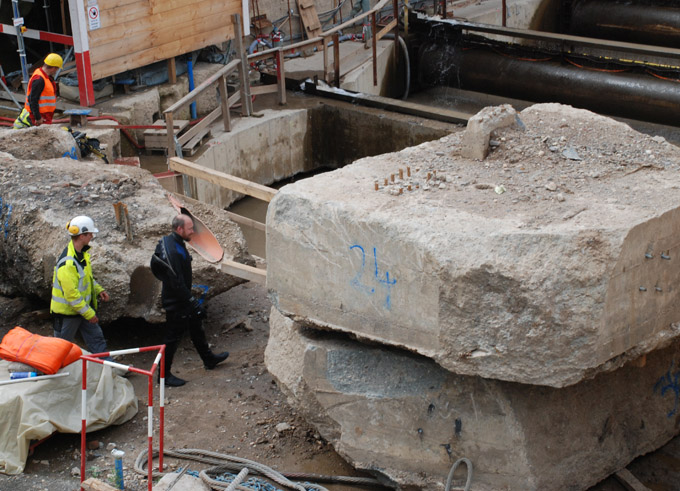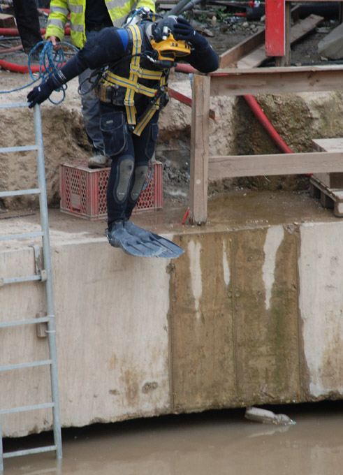 Am Montag, 25. Juli 2011, gaben Dr. Jörg Holzhäuser, Projektleiter für das Bergungsbauwerk, Dr. Bettina Schmidt-Czaia, Leiterin des Historischen Archivs, und Manfred Fiß, stellvertretender Einsatzleiter der Berufsfeuerwehr an der Einsatzstelle Waidmarkt, einen Überblick über die Demontage Unterwasser und den Stand der Archivalienbergung in der Bergungsgrube: Mannshohe Trümmerteile in Ausmaßen von über zwei mal zwei Metern haben die Bergung erheblich erschwert. Diese Betonfindlinge mussten Unterwasser zerschnitten werden, damit man sie beseitigen konnte. Da dort keinerlei Sicht bestand, mussten die Trümmerteile durch ein Unterwassersonar und das Tasten eines Tauchers lokalisiert werden.