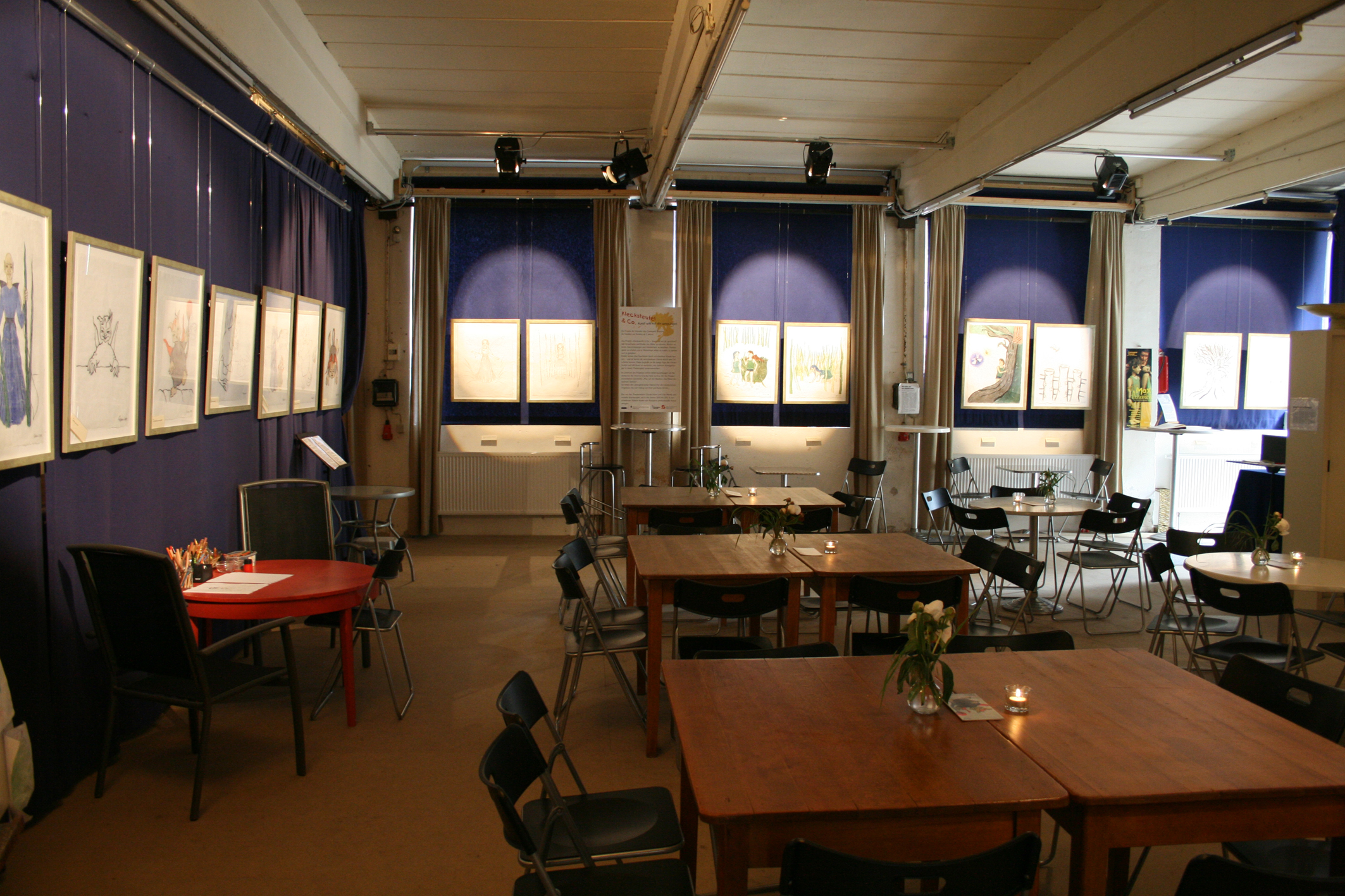 - Die Plätze befinden sich standardmäßig an Tischen. Der Foyerraum wird regelmäßig für Ausstellungen genutzt und ist mit Galeriesystem und Beleuchtung ausgestattet. Einzeln gesicherte Starkstromanschlüsse befinden sich alle fünf Meter an den Raumflanken. Der Raum öffnet sich zum Theatergärtchen hin. Für Feste kann zusätzlich zur Standardbestuhlung ein Dutzend Cateringtische für Büffets zur Verfügung gestellt werden. Zudem steht nach Bedarf eine Bühne zur Verfügung. Die JBL Saalbeschallung ist fest, eine mobile Beschallung ist zustellbar.