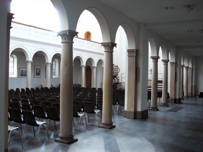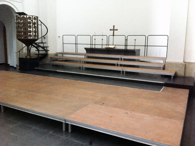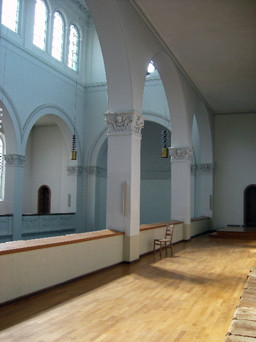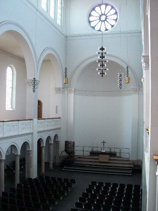 - Die Bestuhlungsmöglichkeiten im Mittelschiff, in beiden Seitenschiffen und auf den zwei Emporen sind flexibel. Für Konzerte ist ein Podest vorhanden, das im Altarraum in verschiedenen Variationen aufgebaut werden kann. Außerdem verfügt die Kirche über Toiletten im Erd- und Obergeschoss. Im Foyer des Gemeindehauses ist ausreichend Platz für eine Garderobe.