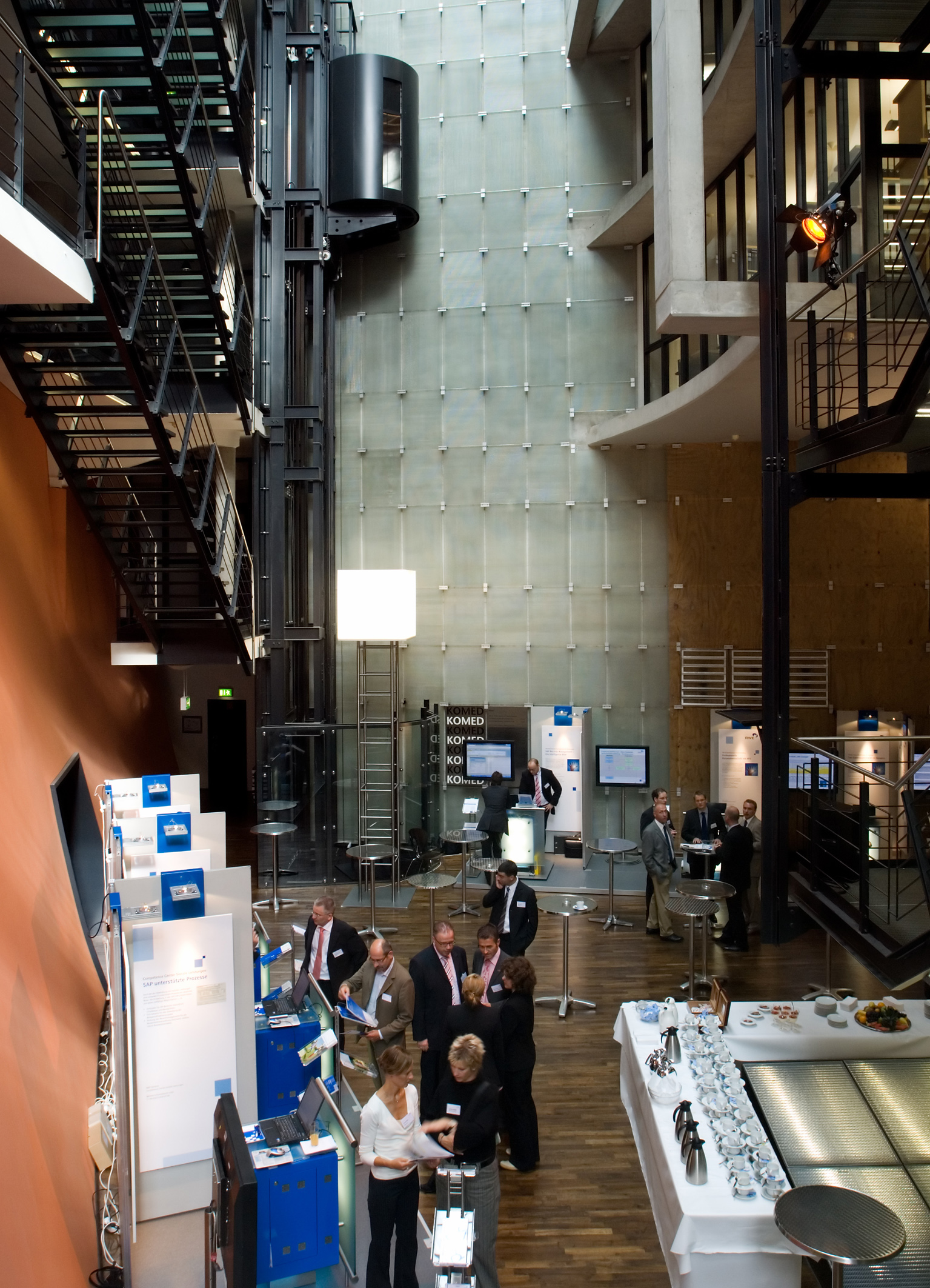 - Der größte Veranstaltungsraum, der KOMED-Saal im KOMED-Haus, überzeugt durch seine ansprechende wie funktionale Architektur. 300 Quadratmeter Fläche bei einer Deckenhöhe von 5,90 Meter eignen sich für anspruchsvolle Veranstaltungen jeder Art. Bewegliche Lamellen in den Wänden garantieren eine ausgezeichnete Akustik. Die durchgehende Glasfront an einer Längsseite des KOMED-Saals ist vollkommen verdunkelbar. Die zentrale Licht- und Tonregie in Kombination mit dem Traversensystem unter der Saaldecke und die leistungsstarke Projektionstechnik genügen höchsten Ansprüchen. Ein direkter Ü-Wagen-Anschluss ermöglicht eine problemlose TV-Aufzeichnung oder Live-Übertragung. Architektonisch ansprechend und funktional ergänzt wird der KOMED-Saal durch das 280 qm große Foyer - ein Lichthof, der sich über sechs Etagen erstreckt. Saal und Foyer sind mit einem hochwertigen Parkettboden ausgestattet. Variable Bühnengrößen von circa 4 bis 6 Meter Tiefe, höhenverstellbare Scherenfußpodeste a 1 mal 2 Meter.