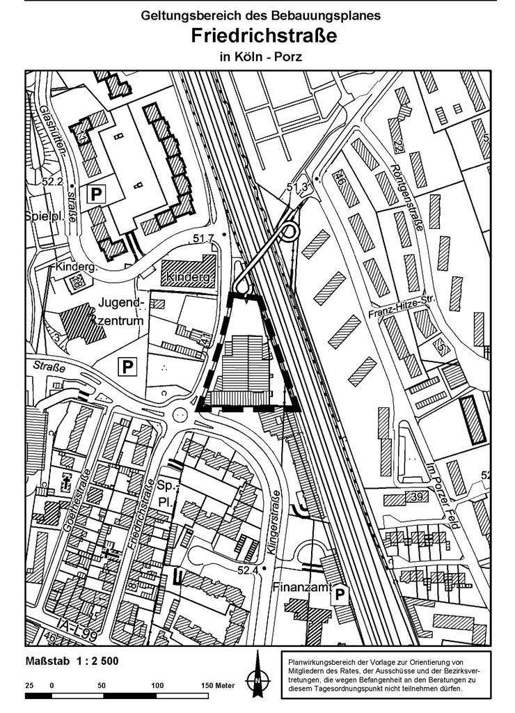 Der Stadtentwicklungsausschuss hat in seiner Sitzung am 27. Januar 2022 unter anderem den Beschluss gefasst, in Anwendung des beschleunigten Verfahrens nach § 13 a Baugesetzbuch ein Bebauungsplanverfahren (vorhabenbezogener Bebauungsplan) für den Bereich begrenzt im Westen durch die Friedrichstraße, im Norden durch ein Brückenbauwerk der Deutschen Bahn, im Osten durch die Bahngleise der Deutschen Bahn und im Süden durch das Grundstück einer Radiologie-Praxis (Gemarkung Urbach, Flur 2, Flurstück 510 und der Gemarkung Porz, Flur 2, Flurstücke 139/2, 2944, 3142, 3145 und 3147) – Arbeitstitel "Friedrichstraße" in Köln-Porz – einzuleiten mit dem Ziel, Wohnraum im Geschoßwohnungsbau unter Anwendung des kooperativen Baulandmodells und eine sechsgruppige Kindertagesstätte festzusetzen.