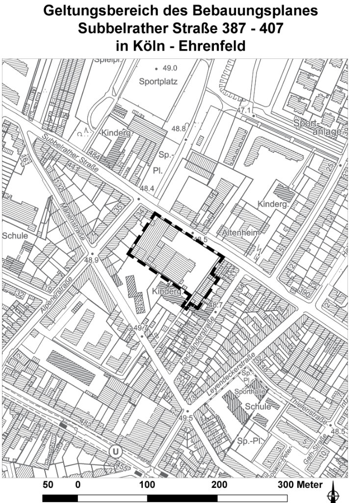 Der Stadtentwicklungsausschuss hat in seiner Sitzung am 20. Juni 2024 unter anderem beschlossen, den gemäß § 12 Absatz 2 Baugesetzbuch (BauGB) am 27. Oktober 2022 gefassten Einleitungsbeschluss für das Bebauungsplanverfahren (Vorhabenbezogener Bebauungsplan) für das Gebiet begrenzt im Norden durch die Subbelrather Straße, im Westen durch Wohnbebauung entlang der Alpener Straße, im Süden durch gemischt genutzte Bebauung (unter anderem Kindertagesstätte) entlang der Marienstraße und im Osten durch Wohnbebauung entlang der Hackländer Straße – Arbeitstitel: Subbelrather Straße 387-407 in Köln-Ehrenfeld – aufzuheben und das Bebauungsplanverfahren einzustellen.