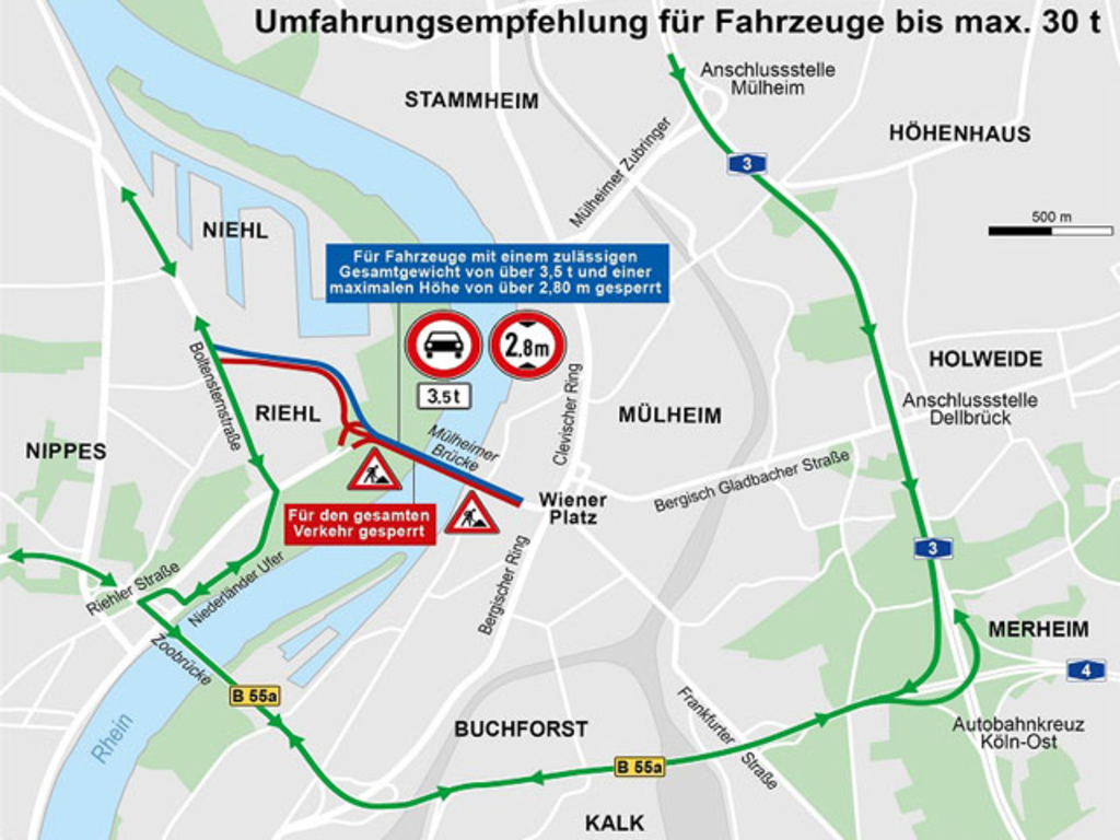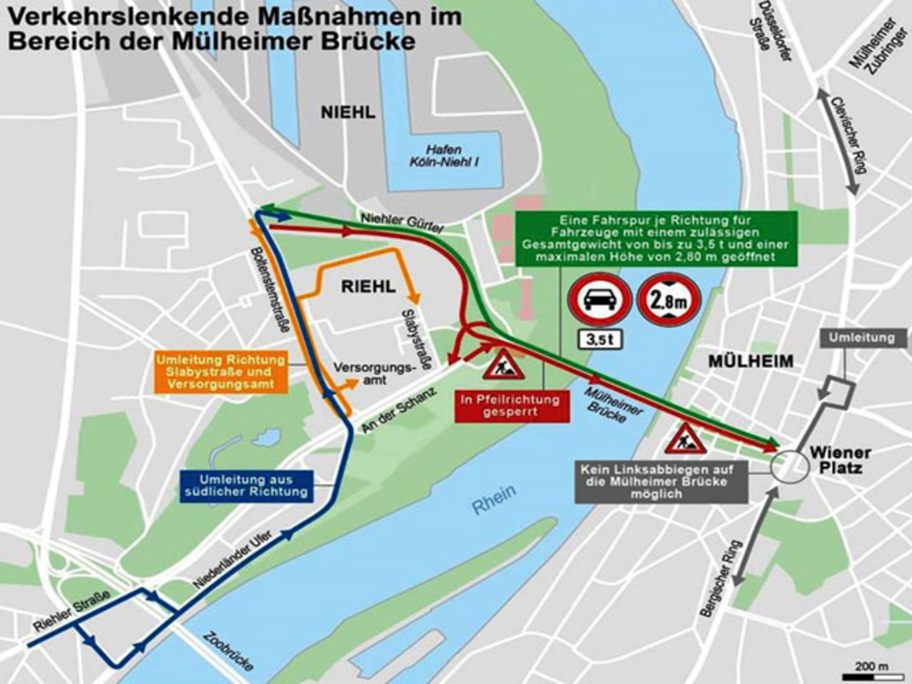 - Sperrung des Linksabbiegers vom Bergischen Ring auf die Mülheimer Brücke. Mit rund 200 Fahrzeugen in der Spitzenstunde ist die für andere Strecken entstehende Verkehrsbelastung eher als gering anzusehen. Autofahrende sollten eine großräumige Ausweichroute oder die lokale Umleitung über die Wendefahrt in Höhe Bergisch Gladbacher Straße/Genovevastraße/Carl-Brisch-Straße nutzen.
