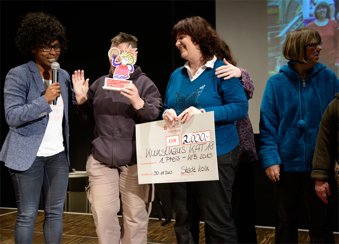 Der mit 2.000 Euro dotierte erste Preis wurde an das Kunsthaus KAT 18 vergeben. Die Laudatio hielt die diesjährige Schirmherrin Shary Reeves - Moderatorin, Schauspielerin, Autorin, Hörbuchsprecherin und ehemalige Bundesligafußballspielerin sowie Sportbotschafterin der Stadt Köln.