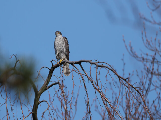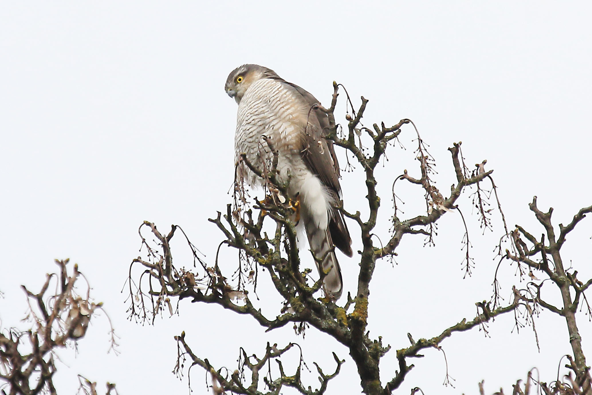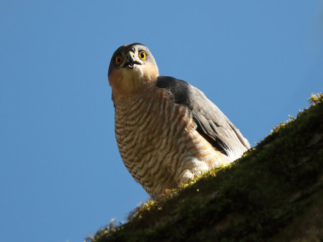 Weibliche Sperber besitzen ein weißes Brustgefieder mit dunkler Querbänderung.