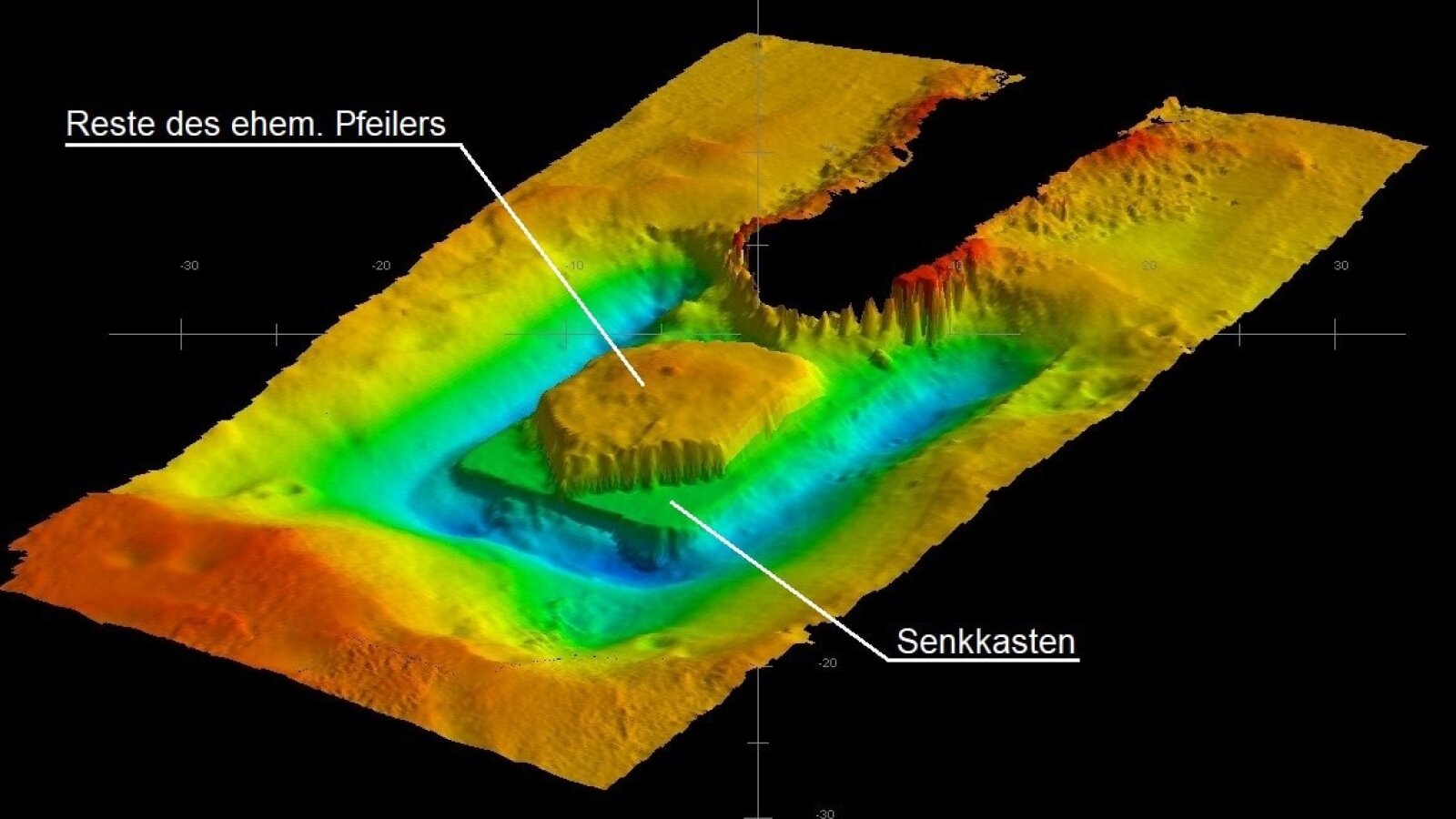 Wir führten eine Peilung mit einem Vermessungsschiff durch. Dadurch wurde ersichtlich, dass die Senkkästen vollständig und ausreichend mit dem zuvor aufgeschütteten Füllmaterial überdeckt sind. Mit dieser Peilung stellten wir sicher, dass die Senkkästen ausreichend befestigt sind.