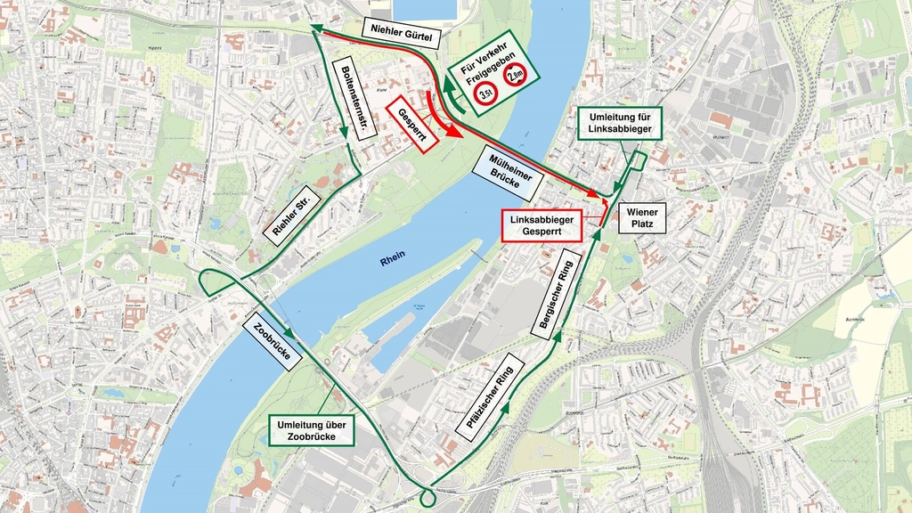 • Sperrung des Linksabbiegers vom Bergischen Ring auf die Mülheimer Brücke. Mit rund 200 Fahrzeugen in der Spitzenstunde ist die für andere Strecken entstehende Verkehrsbelastung eher als gering anzusehen. Autofahrende sollten eine großräumige Ausweichroute oder die lokale Umleitung über die Wendefahrt in Höhe Bergisch Gladbacher Straße/Genovevastraße/Carl-Brisch-Straße nutzen.