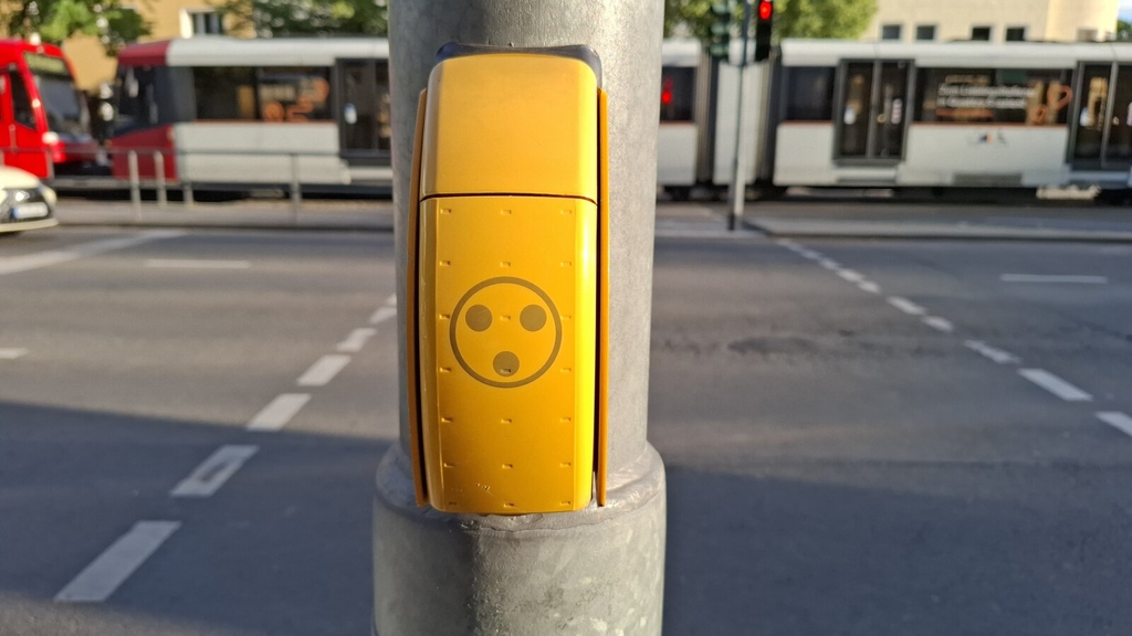 - Der Taster mit drei schwarzen Punkten im Kreis gibt ein aktustisches Signal ab, wann die Fußgängerampel grün ist.