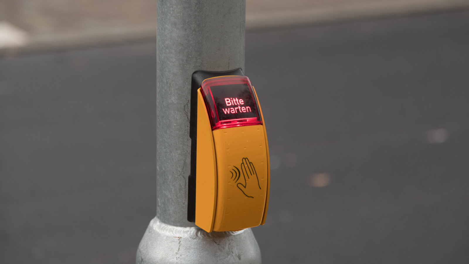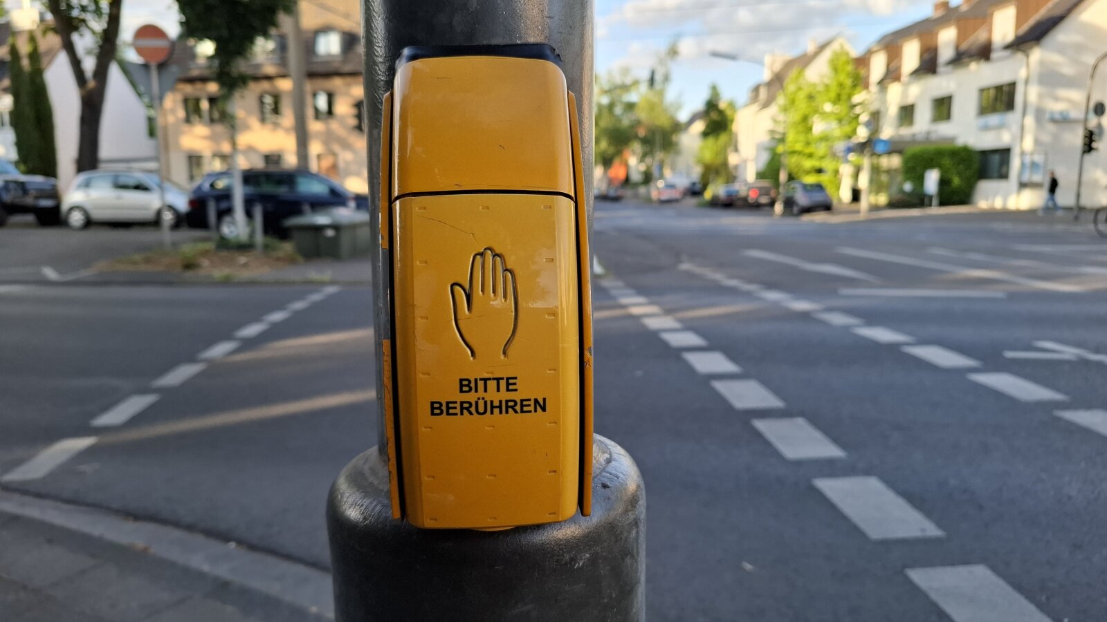 - Der Taster mit der Aufschrift "Bitte berühren" fordert das Grünsignal an, wenn Sie ihn berühren. Somit kann er auch von Sehenden genutzt werden.