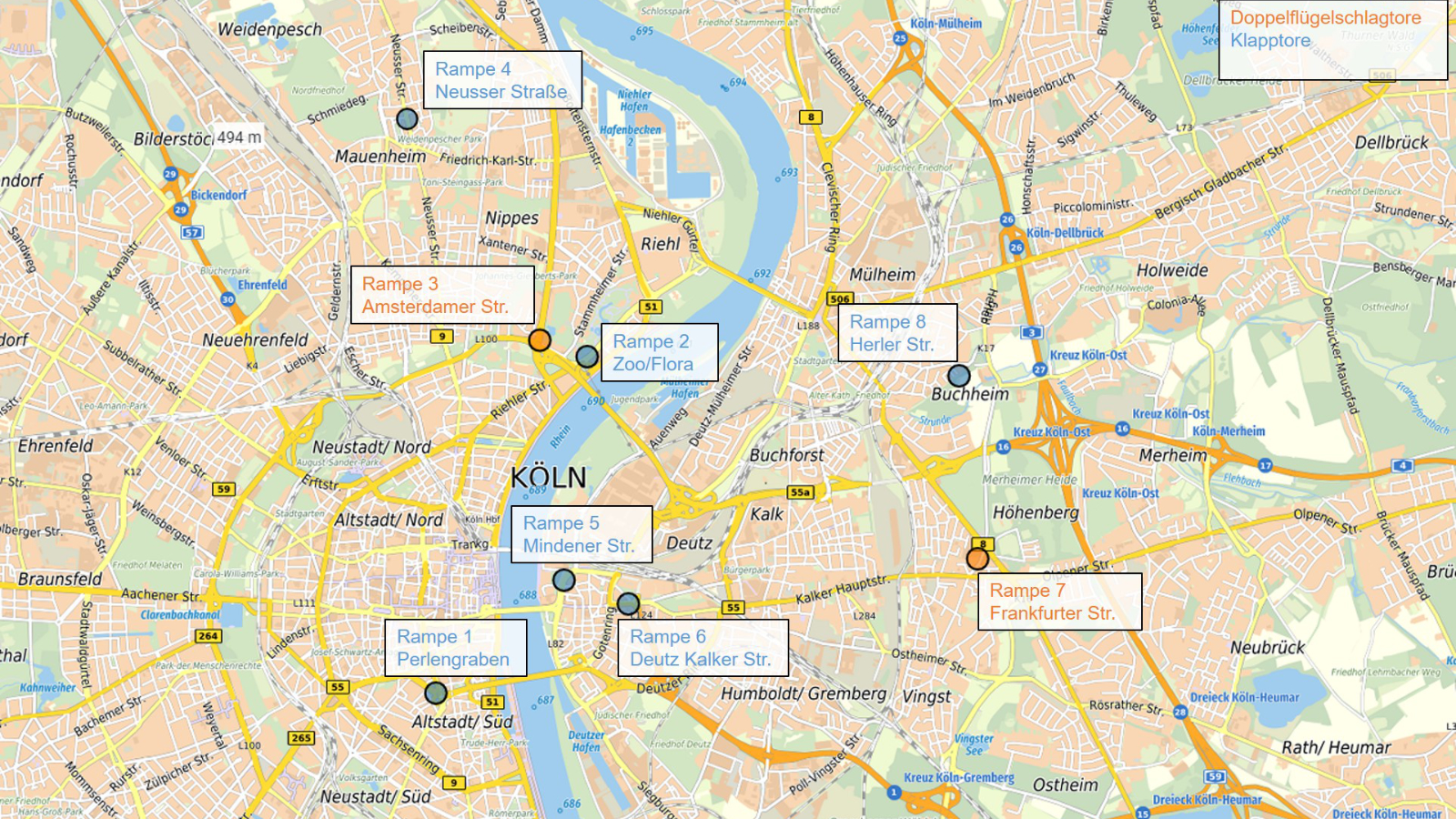Wir sehen gestalterische Maßnahmen für die Rampen vor, welche mit einem Klapptor mit Elektrohubzylinder betrieben werden sollen. Um sie in das Stadtbild einzufügen, werden wir die Antriebe der Tore unter einer Hülle verdecken. Dabei betrachten wir die Lage vor Ort. Die architektonische Gestaltung der sichtbaren Aufbauten planen wir zuerst für die Rampen am Perlengraben, an der Mindener Straße und an der Deutz-Kalker Straße.