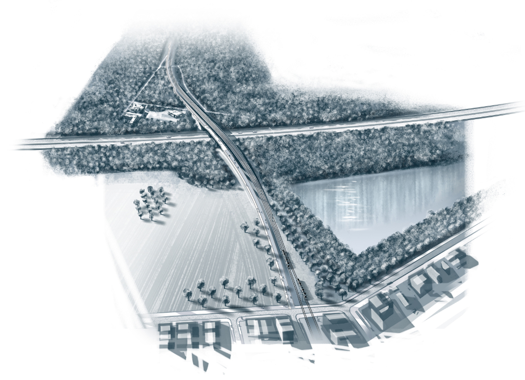 Auf dem Weg nach Rondorf überquert die StadtBahn Süd die Bundesautobahn 4 über eine neue Brücke. Damit werden wir sowohl das bestehende Rondorf als auch das neu entstehende Wohngebiet Rondorf Nord-West mit anbinden. Südlich der Kapellenstraße verläuft die Stadtbahn zwischen der Talstraße und der Eibinger Straße. Anschließend fährt sie Richtung Westen nach Meschenich.