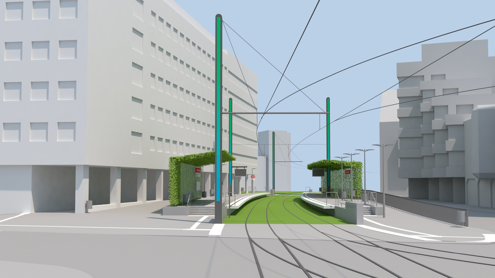 Die Gleise bauen wir im gesamten Abschnitt als Rasengleise. Im Zuge dieser Umbauarbeiten werden wir die Neue Weyerstraße in Fahrtrichtung stadteinwärts neu gestalten. Wir planen erstmalig im Kölner Stadtbahnnetz die Begrünung der Fahrgastunterstände sowie eine natürliche Versickerung des Regenwassers.