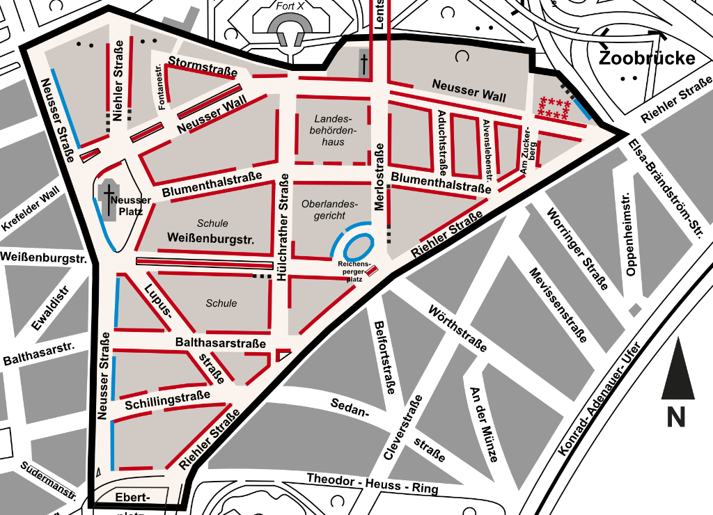 Im Gebiet innerhalb der Neusser Straße, des Ebertplatzes, der Riehler Straße, der Amsterdamer Straße, des Neusser Walls, der Stormstraße und der  Inneren Kanalstraße können Sie mit dem Bewohnerparkausweis "AGN II" auf Parkplätzen mit Parkscheinautomaten mit dem "roten Punkt" gebührenfrei parken. Ausnahmen sind Parkplätze mit Parkscheinautomaten ohne den "roten Punkt".