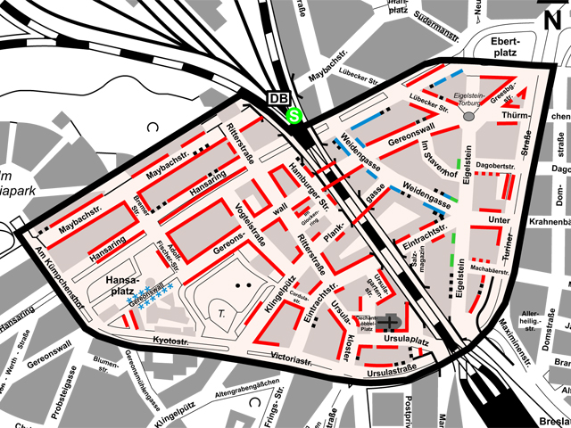 Im Gebiet innerhalb der Maybachstraße, Am Kümpchenshof, der Kyotostraße, der Victoriastraße, der Ursulastraße, der Turiner Straße und des Hansarings können Sie mit dem "roten Punkt" gebührenfrei parken. Ausnahmen sind Parkplätze mit Parkscheinautomaten ohne den "roten Punkt".