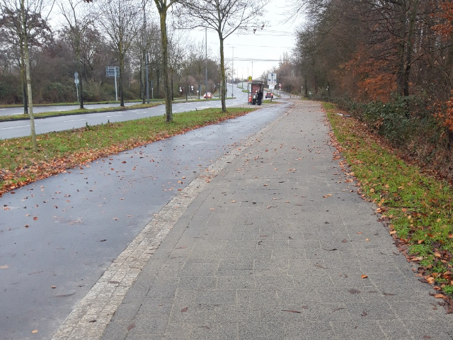 In Chorweiler haben wir auf der Merianstraße zwischen der Brücke Fühlinger See und Neusser Landstraße die südlichen Nebenanlagen und die Bushaltestelle saniert und umgestaltet. Auf einer Länge von circa 350 Meter wurde der Geh- und Radweg in Asphalt beziehungsweise Gehwegplatten gebaut. Entsprechend dem Gestaltunghandbuch wurde zwischen Geh- und Radweg ein taktiler Streifen vorgesehen. Die frühere Busbucht haben wir in einen Buskap umgebaut. Hierdurch kann der Bus gerade an die Haltestelle fahren, wodurch ein barrierefreier Einstieg erleichtert wird. In den Kreuzungsbereichen wurden taktile Elemente und neue Bordsteine eingebaut.