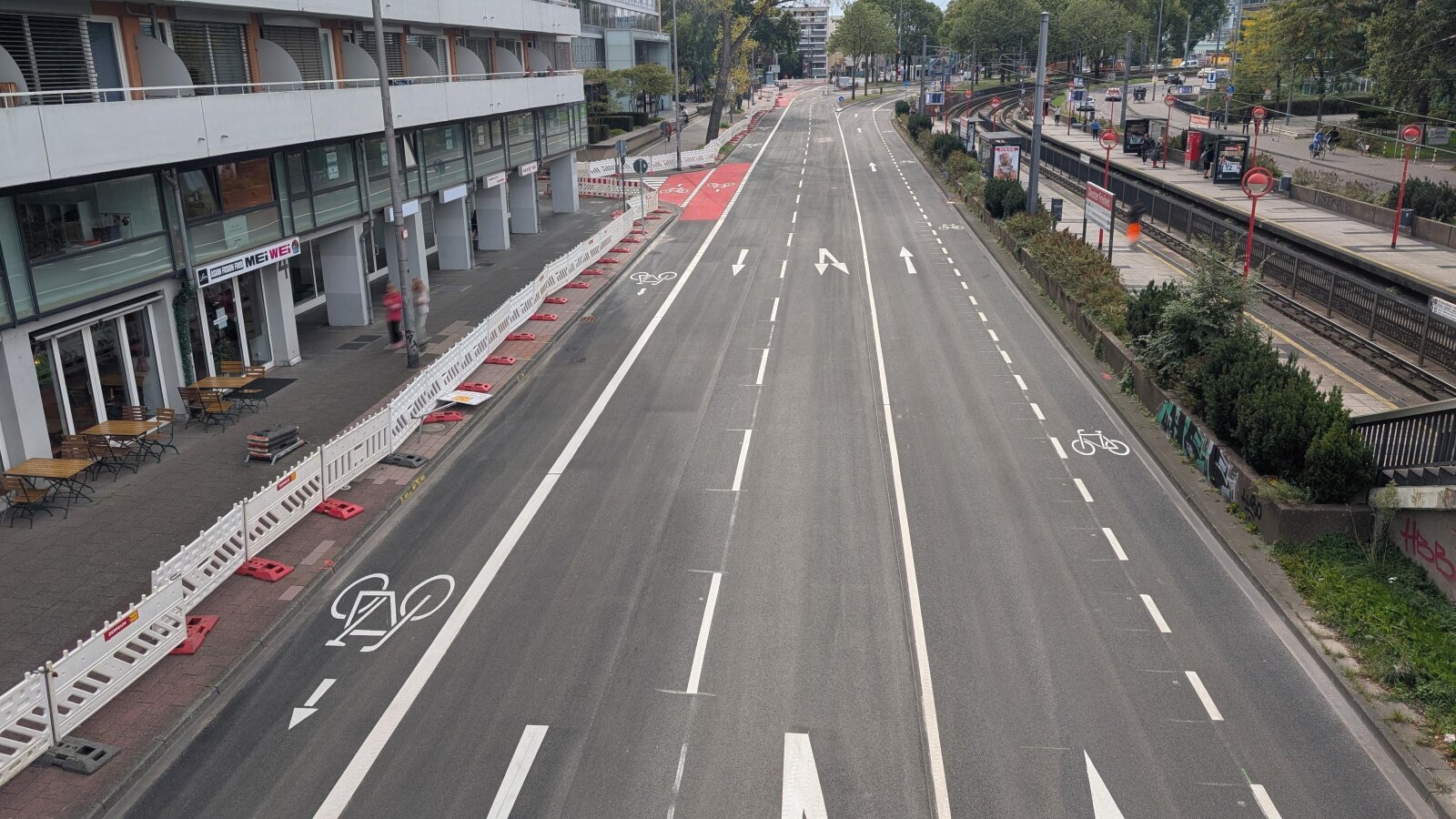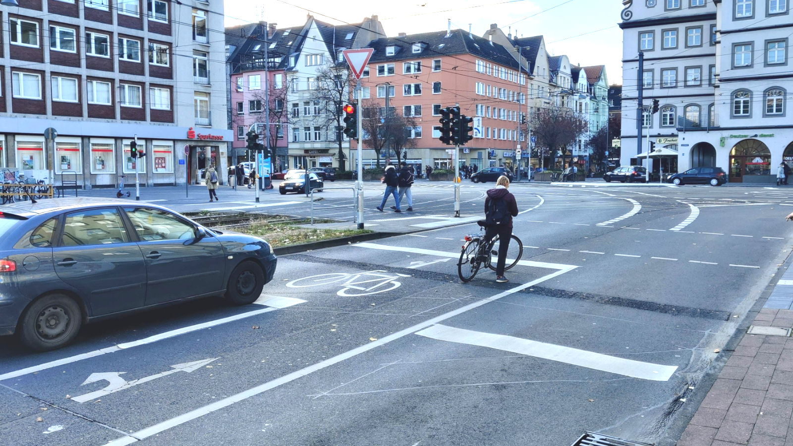 Um einen eigenen Fahrstreifen für den Radverkehr vom Perlengraben auf den Rothgerberbach zu schaffen, haben wir im September 2024 die Geradeausspuren für den Kfz-Verkehr von drei auf zwei reduziert und weitere Verbesserungen für den Radverkehr umgesetzt.