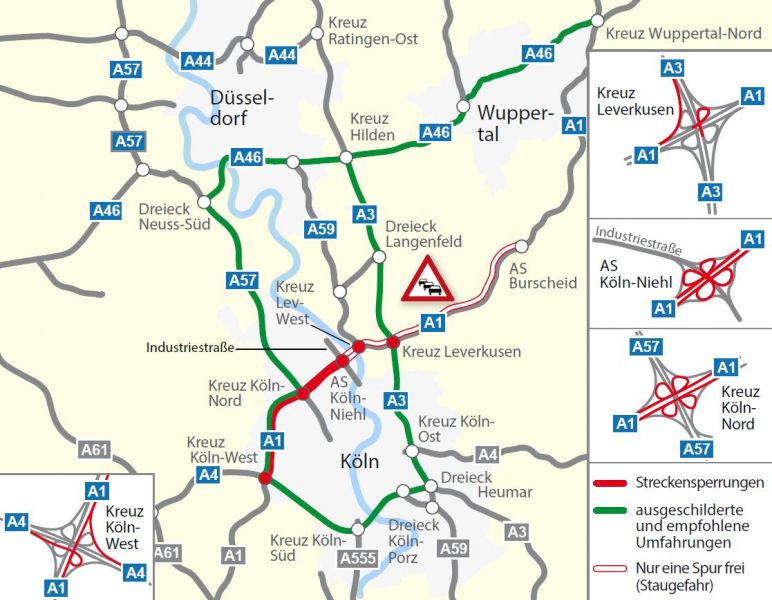 Im Zuge von Bauarbeiten am westlichen Kölner Autobahnring kommt es in mehreren Abschnitten zu Sperrungen und Fahrbahneinengungen. Vorrangige Ausweichrouten sind die A3, A4, A46 und die A57. Es besteht im ganzen Kölner Raum erhöhte Staugefahr. Die Sperrungen erfolgen von Freitag, 31. August 2018, 22 Uhr, durchgehend bis Montag, 3. September 2018, 5 Uhr. Detaillierte Informationen entnehmen Sie bitte der nachfolgenden Verlinkung.