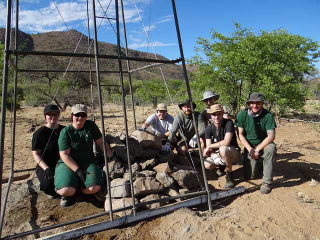 Für die Wasserstelle wurden vorher große Felsen ausgekundschaftet, die später das Becken der Wasserstelle bilden sollten. Diese Felsen wurden mit Spaten und Spitzhacke freigelegt und ausgegraben. Um das Wasser zu stauen, mussten noch einige Mauern mit gesammelten Steinen und Beton angelegt werden. Anschließend haben wir noch Rohre vom Wasserloch zu einer vorhandenen Windkraftpumpe verlegt. Die Rohrleitung von der Pumpe zur Wasserstelle musste mindestens 50 cm tief vergraben werden, da die Elefanten diese sonst auf der Suche nach Wasser beschädigen können. Mit der Windkraftpumpe wird das Wasserloch mit Grundwasser gefüllt.