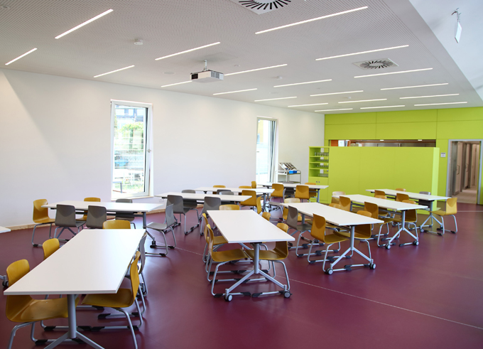 Der neue Gebäuderiegel mit zeitgemäßen, barrierefreien Räumen auf rund 190 Quadratmetern Nutzfläche verbindet das Hauptgebäude nunmehr mit Trakt C der Schule und begrenzt den Schulhof nach Osten.