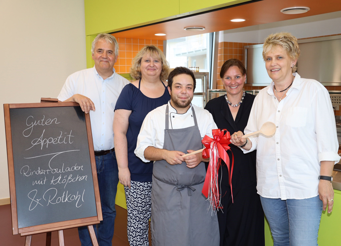 Zur Feier des Tages gab es Rouladen, aber das war tatsächlich dem Zufall des Menüplans geschuldet. Am 19. Juni 2019 haben wir symbolisch einen Kochlöffel statt eines Schlüssels an die Schulleitung und die Christliche Sozialhilfe Köln als OGS-Träger für das neue Mensa-Gebäude übergeben.
